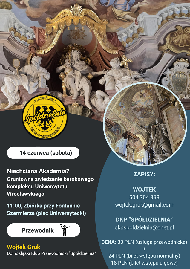 Dolnośląski Klub Przewodnicki „Spółdzielnia” zaprasza na kolejny spacer przygotowany przez naszego stowarzyszeniowego kolegę Wojtka Gruka. Tym razem oprowadzi on po kościele uniwersyteckim, a także najpiękniejszych wnętrzach barokowego gmachu głównego Uniwersytetu Wrocławskiego (dawnej akademii jezuickiej): Auli Leopoldyńskiej, Oratorium Marianum i Schodach Cesarskich.