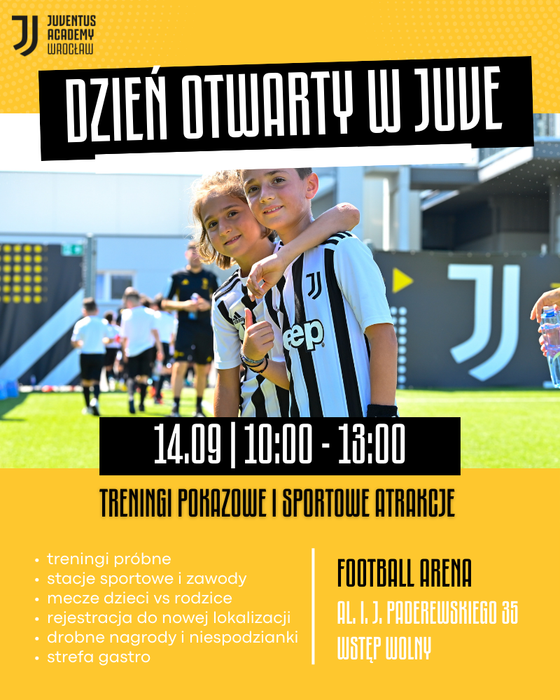 Juventus Academy Wrocław z radością zaprasza dzieci, młodzież i rodziców na wyjątkowy, darmowy dzień otwarty, organizowany z okazji otwarcia naszej nowej lokalizacji na Football Arenie. To doskonała okazja, by spędzić niedzielne przedpołudnie w atmosferze futbolowych emocji, poznać nowych przyjaciół i rozpocząć piękną przygodę ze sportem.