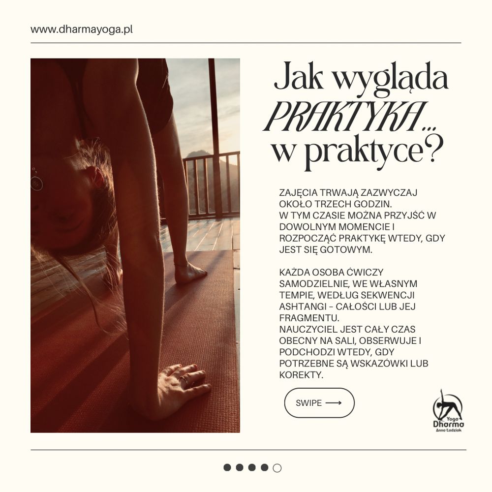 Praktyka Mysore to indywidualna forma Ashtangi, w której praktykujesz we własnym tempie, a nauczyciel jest obecny na sali, oferując indywidualne wsparcie i delikatne korekty. To przestrzeń, gdzie możesz skupić się na swojej praktyce, niezależnie od poziomu zaawansowania.
