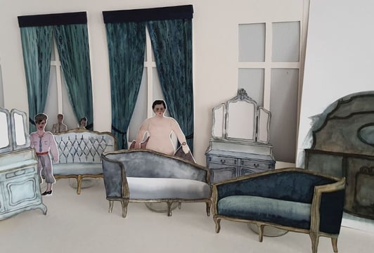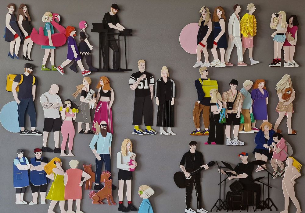 Wystawa „Kasia Kmita/ Warstwy” prezentuje przekrój twórczości artystki – na ekspozycje składają się ludowe wycinanki nawiązujące do popkultury, prace malarskie, instalacje z papieru i fotografie. Ważny element prezentacji stanowi praca pochodząca z wystawy w Muzeum Powstania Warszawskiego – papierowe modele warszawskich kamienic z mebelkami oraz laleczki, które stworzyła dla swojej córki Róży artystka – graficzka Janina Giedroyć-Wawrzynowicz w czasach okupacji.