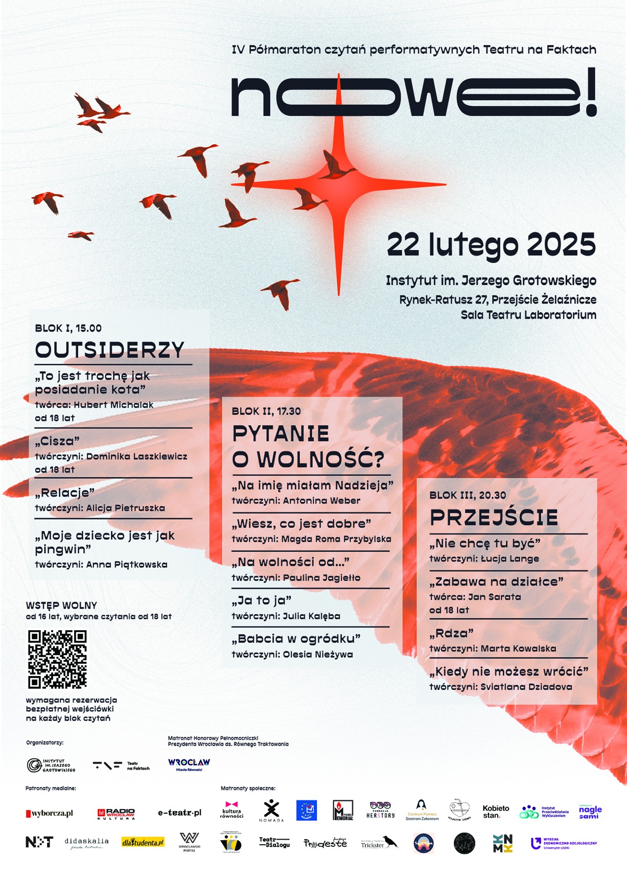 Zapraszamy na czwartą edycję półmaratonu „Nowe!” – wydarzenia prezentującego trzynaście poruszających czytań performatywnych opartych na prawdziwych historiach. Wstęp wolny, wymagana rezerwacja bezpłatnej wejściówki. Aby uczestniczyć w całości, należy pobrać wejściówki na każdy blok.