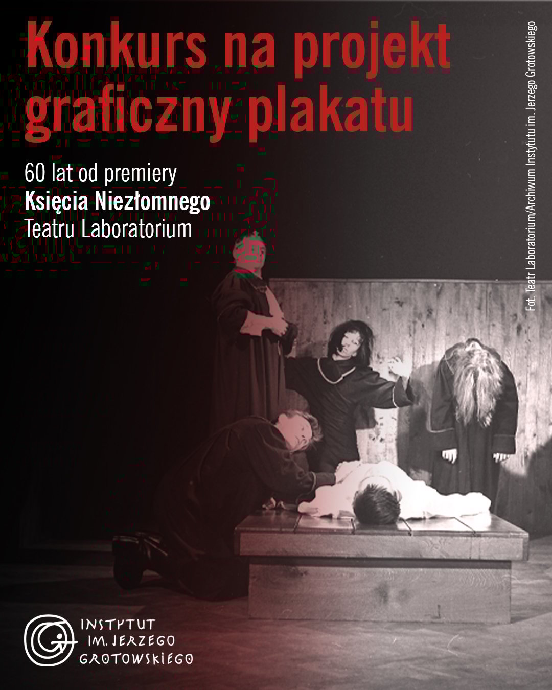W 60. rocznicę premiery spektaklu „Książę Niezłomny” Teatru Laboratorium Instytut im. Jerzego Grotowskiego ogłasza konkurs na projekt graficzny plakatu. Konkurs skierowany jest do grafików i graficzek, projektantów i projektantek, artystów i artystek oraz osób zajmujących się projektowaniem graficznym. „Książę Niezłomny” stał się jednym z najsłynniejszych przedstawień Grotowskiego i wszedł do kanonu arcydzieł teatru XX wieku. Był pokazywany podczas gościnnych występów Teatru Laboratorium w Polsce i przede wszystkim za granicą: w Szwecji, Danii, Norwegii, Francji, Amsterdamie, we Włoszech, Jugosławii, Meksyku, Wielkiej Brytanii, Stanach Zjednoczonych, Iranie i Niemczech, wszędzie wzbudzając podziw dla kreacji Ryszarda Cieślaka. Aktor po występach w Nowym Jorku jesienią 1969 roku został uznany przez krytyków za najwybitniejszego aktora teatrów off-Broadway, zajmując pierwsze miejsce w dwóch kategoriach: jako „najwybitniejszy aktualnie twórca w dziedzinie aktorstwa” oraz jako „aktor największych nadziei”.