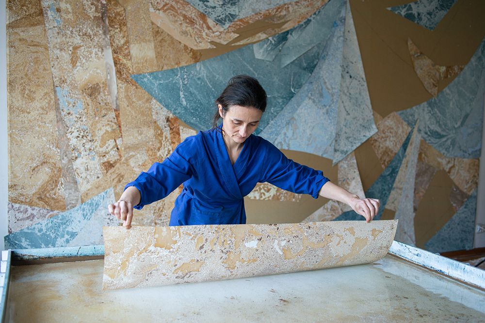 Korzeniecka prezentuje hipnotyzujące, płynne kompozycje inspirowane techniką ebru. Mikrokosmosy malowane farbą unoszącą się na powierzchni wody przypominają ruchy mgławic, dryfujących galaktyk czy pulsujących układów planetarnych.
