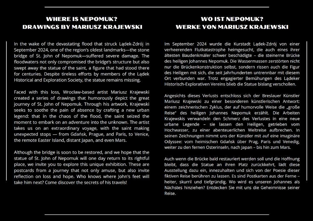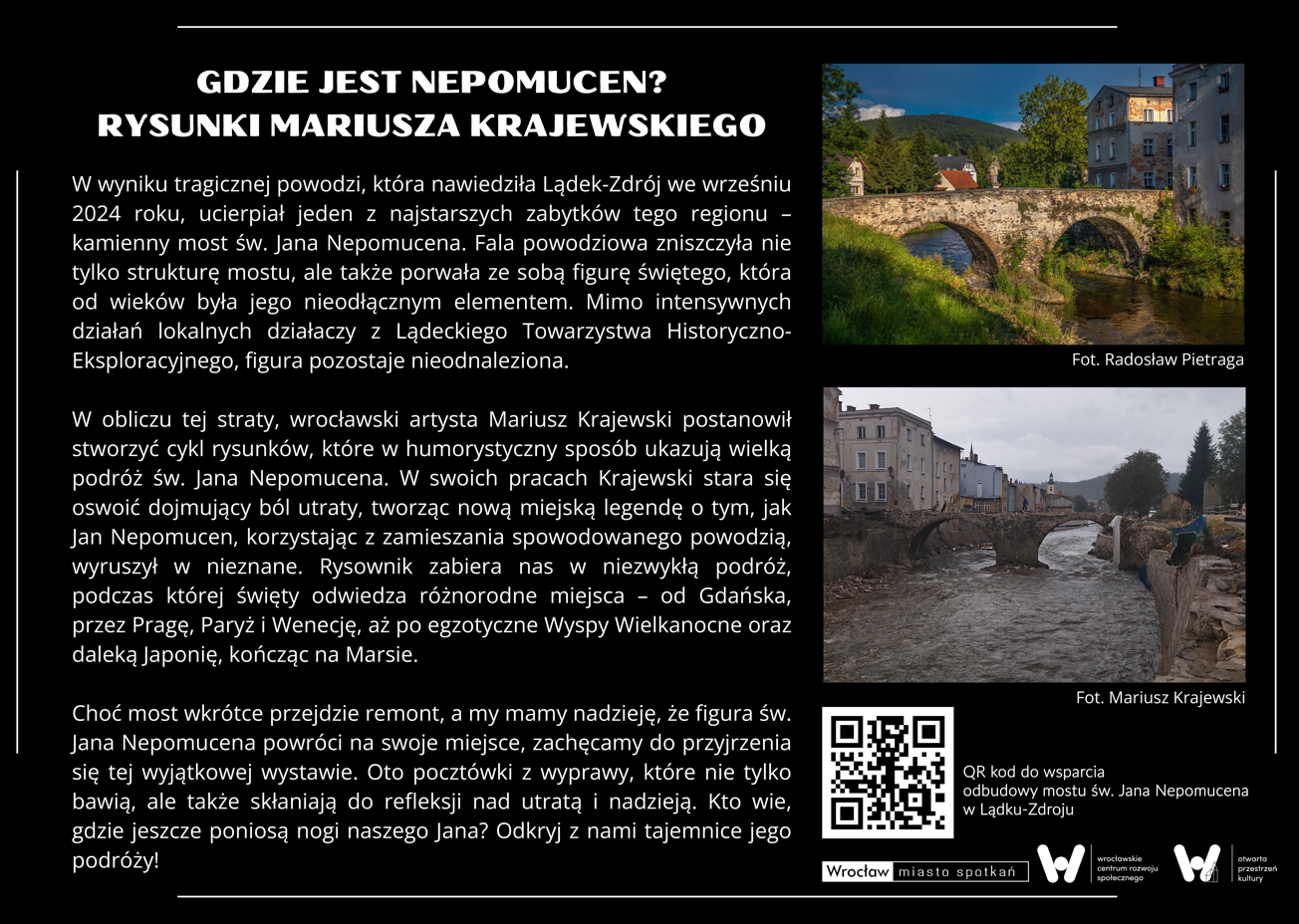 Rysownik zabiera nas w niezwykłą podróż, podczas której święty odwiedza różnorodne miejsca – od Gdańska, przez Pragę, Paryż i Wenecję, aż po egzotyczne Wyspy Wielkanocne oraz daleką Japonię, kończąc na Marsie. Choć most wkrótce przejdzie remont, a my mamy nadzieję, że figura św. Jana Nepomucena powróci na swoje miejsce, zachęcamy do przyjrzenia się tej wyjątkowej wystawie.