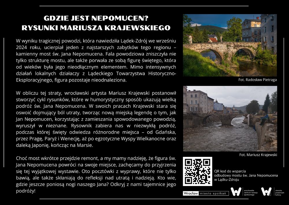 W obliczu tej straty, wrocławski artysta Mariusz Krajewski postanowił stworzyć cykl rysunków, które w humorystyczny sposób ukazują wielką podróż św. Jana Nepomucena. W swoich pracach Krajewski stara się oswoić dojmujący ból utraty, tworząc nową miejską legendę o tym, jak Jan Nepomucen, korzystając z zamieszania spowodowanego powodzią, wyruszył w nieznane.