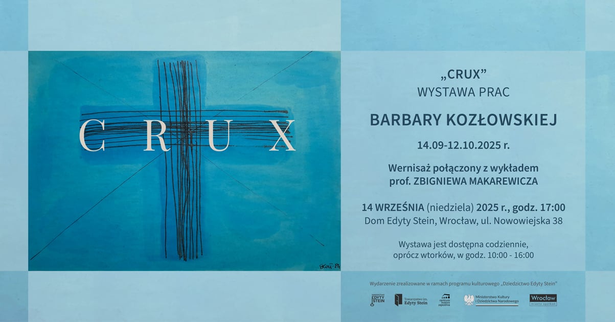 Wystawa „Crux” prezentuje cykl prac Barbary Kozłowskiej powstałych w latach 1984-1985, będących kontynuacją jej wcześniejszych studiów nad „Literą TAU”. Artystka podejmuje refleksję nad motywem krzyża – znakiem o głębokim znaczeniu symbolicznym, historycznym i duchowym. Krzyż, jako figura geometryczna i symbol, obecny jest w wielu dziedzinach sztuki. Kozłowska traktuje go jako punkt wyjścia do medytacji artystycznej, czego wyrazem są szkice oraz prace wykonane w technice akwareli i tempery. Wśród nich znajdują się m.in. „Krzyż promienisty”, „Krzyż słoneczny” oraz „Krzyż z Dachau” – dzieło nawiązujące do tragicznej historii ojca artystki, Zygmunta Kozłowskiego, który zginął w obozie koncentracyjnym w 1943 roku.