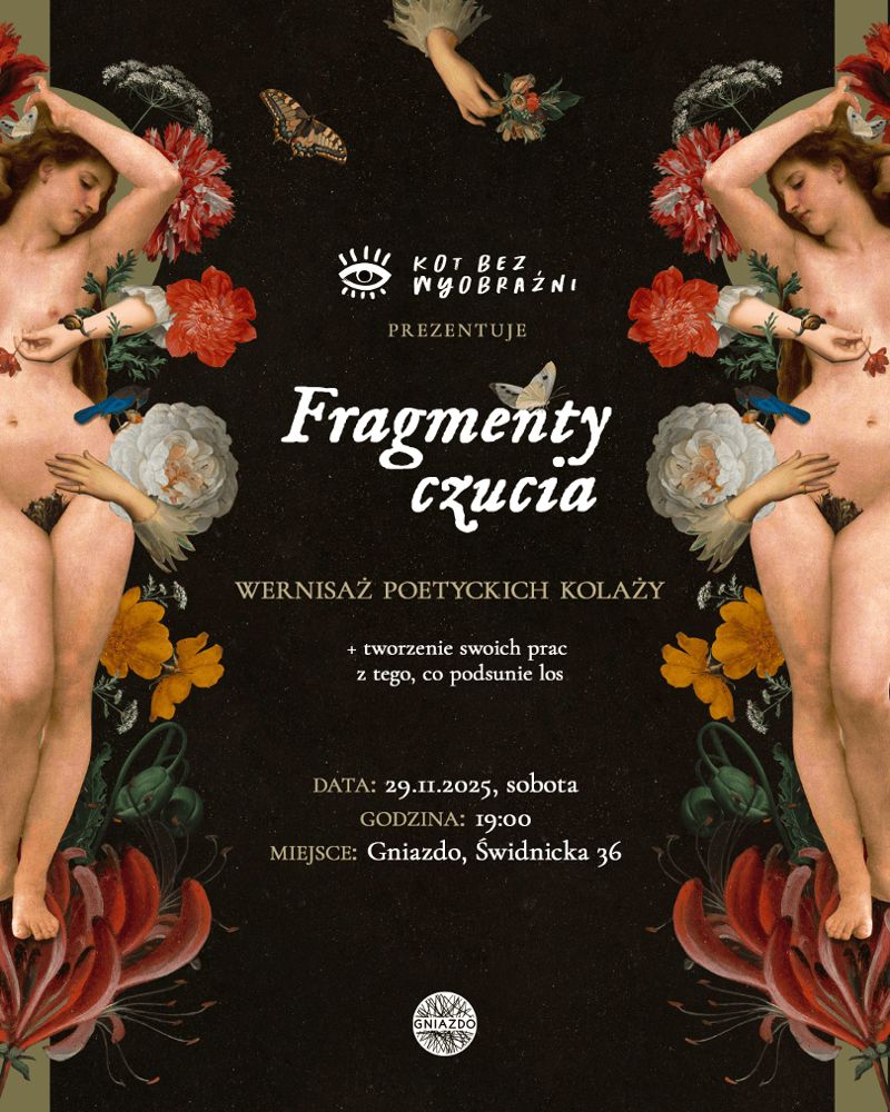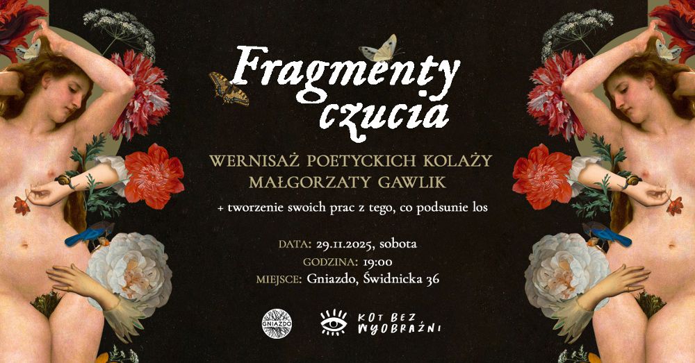 Zapraszamy na wernisaż poetyckich kolaży Małgorzaty Gawlik pt. „Fragmenty czucia”, który odbędzie się w Kawiarni Gniazdo, ul. Świdnicka 36 we Wrocławiu, 29 listopada (sobota) o godz. 19:00. To kolejna okazja na wyjątkowy wieczór w artystycznym klimacie, przesiąknięty magia, tajemnicą i sztuką.