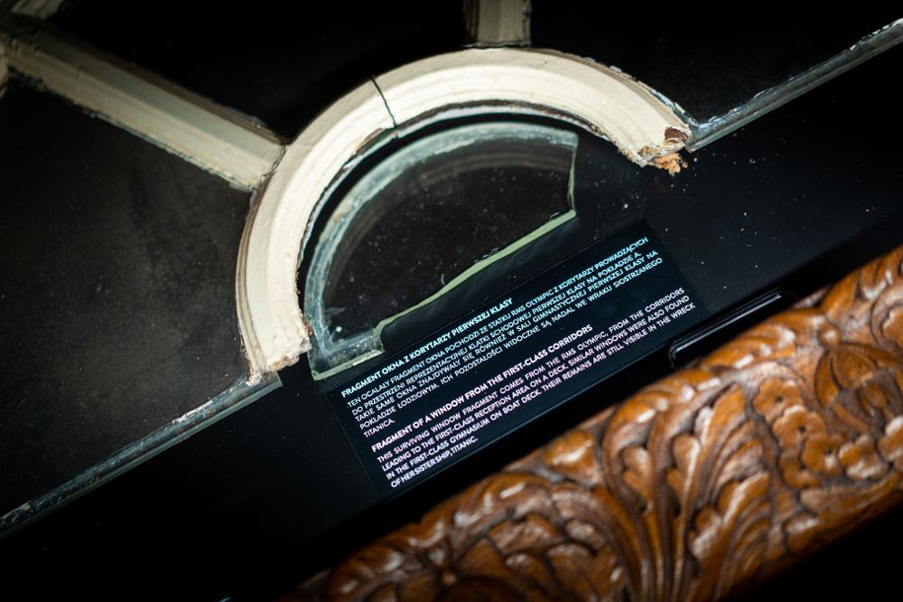 Fragment oryginalnego okna z pierwszej klasy jednego z liniowców, umieszczony w gablocie z opisem ekspozycyjnym.