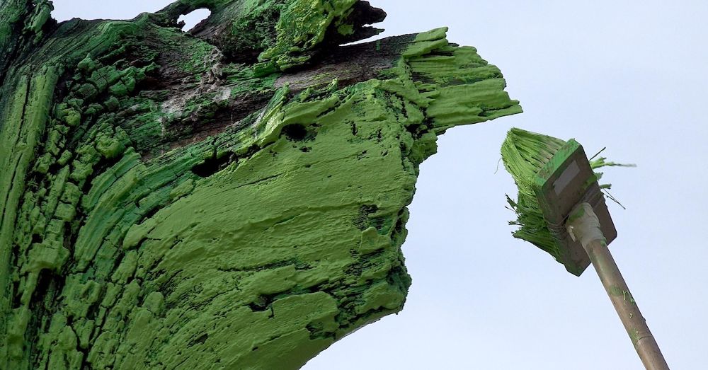 „W momencie, gdy młode drzewa będą dostawać liście, korzenie martwego należy pomalować na zielono. Czynność tę należy powtarzać corocznie wiosną.”