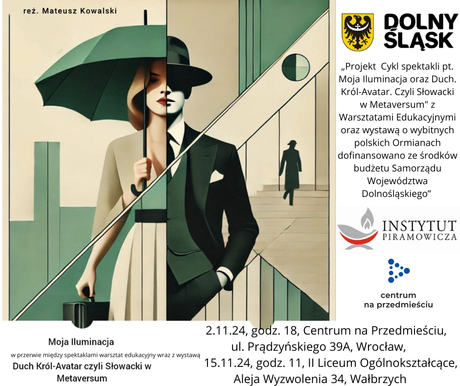 Projekt "Cykl spektakli pt. Moja Iluminacja oraz Duch. Król-Avatar. Czyli Słowacki w Metaversum" z warsztatami edukacyjnymi oraz wystawą o wybitnych polskich Ormianach dofinansowano ze środków budżetu Samorządu Województwa Dolnośląskiego.