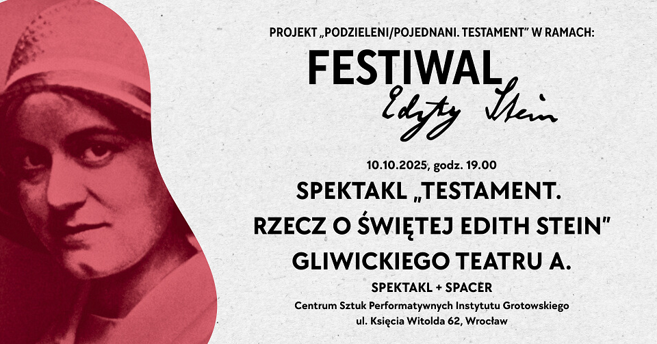 „Testament. Rzecz o świętej Edith Stein” – wrocławska premiera autorskiego przedstawienia Teatru A, które poświęcone jest wybitnej postaci naszego Miasta, Edycie Stein – św. Teresie Benedykcie od Krzyża, w 134 rocznicę jej urodzin (12.10.1891)