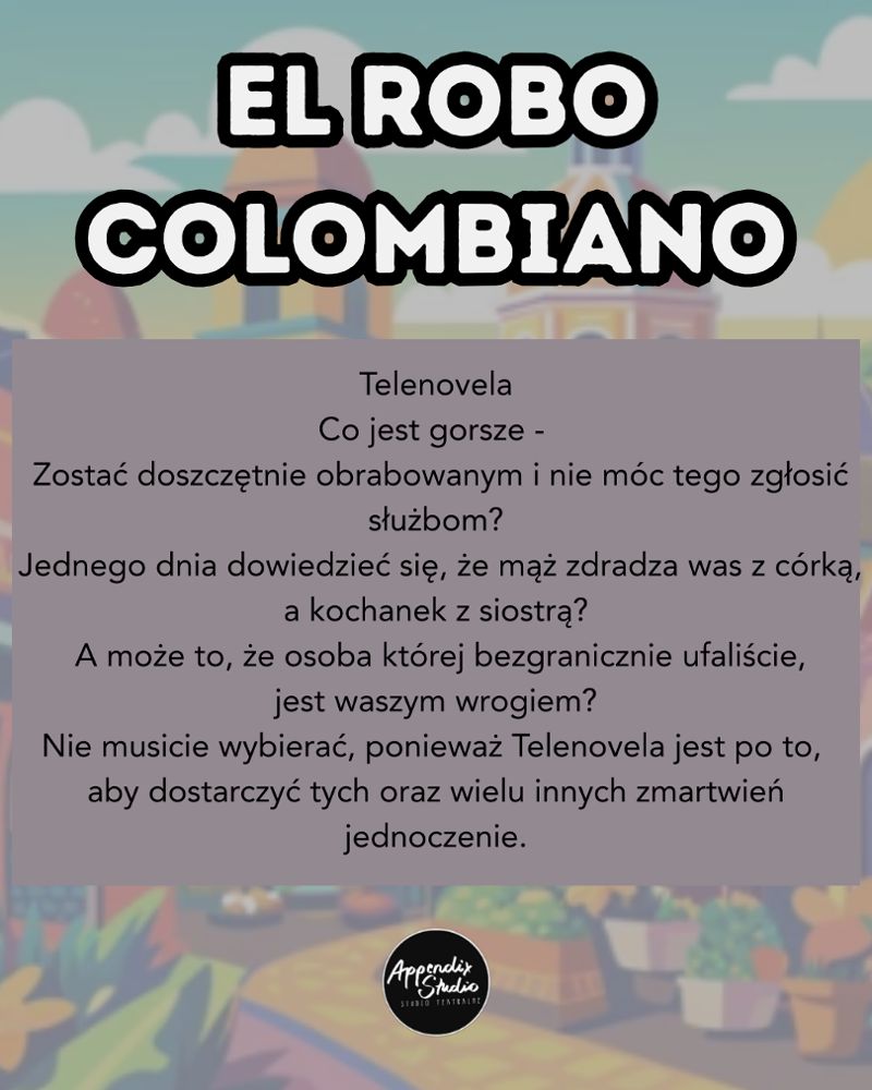 W weekend 10-12 października wpadajcie na Ruską 46a do Appendix Studio! Zagramy spektakle z naszego Miniserialu teatralnego, którego odcinki rozgrywają się w różnych częściach świata. Detektyw wraz ze swoją asystentką rozwiązują zagadki tajemniczych morderstw – tym razem przeniesiemy się kolejno do Kolumbii i Japonii!