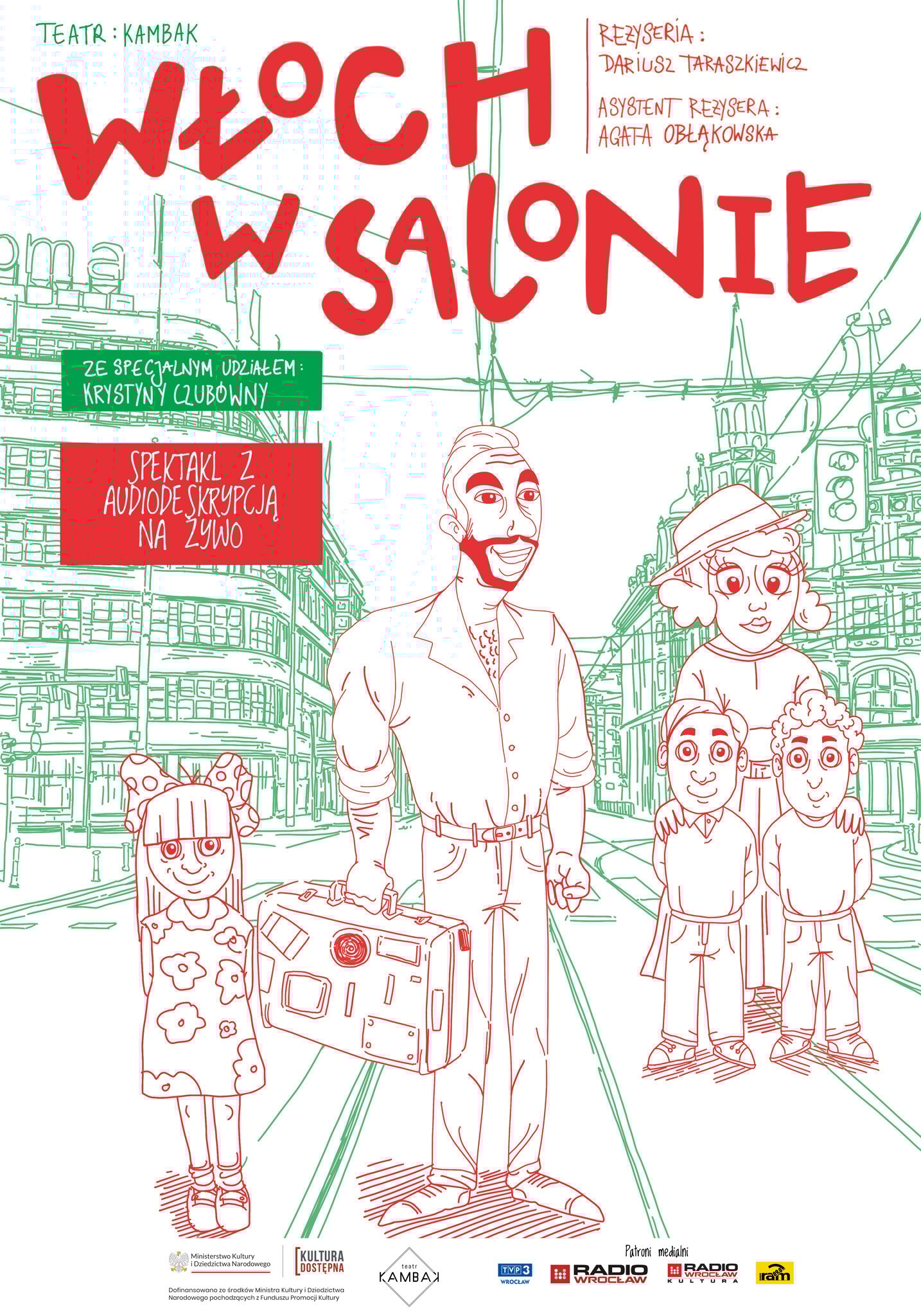 „Włoch w salonie” autorstwa Huberta Michalaka, to tytuł przewrotnej, prapremierowej komedii napisanej specjalnie dla Teatru KAMBAK. Spektakl opowiada historię dwóch rodzin: mieszkającej we Wrocławiu matki, samotnie wychowującej dwóch synów i pochodzącego z Como ojca, opiekującego się córką. Obie rodziny postanawiają skorzystać z programu zamiany mieszkań na wakacje. Z powodu niekontrolowanych zbiegów okoliczności zostają zmuszeni do spędzenia nocy w jednym, wrocławskim mieszkaniu. To spotkanie pokaże, jak różni i jak podobni są mieszkańcy naszego kontynentu. Kontrasty temperamentów, różnice w postrzeganiu rzeczywistości innych pokoleń, ważne i niełatwe tematy, ale przedstawione w sposób lekki, dostępny z porcją zdrowego śmiechu to atuty tego spektaklu.