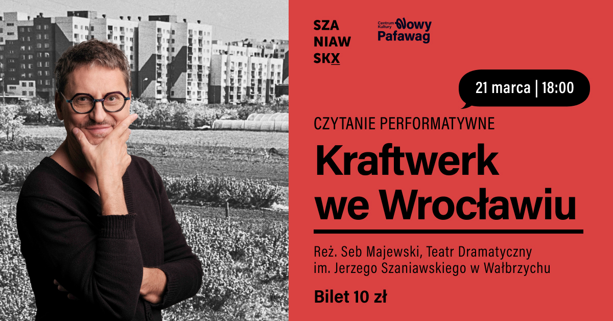 kraftwerk we wrocławiu dramat zadedykowany osiedlu nowy dwór autor: seb majewski zdania od autora: urodziłem się na Nowym Dworze w 1971 roku do 1979 roku mieszkałem w poniemieckim bloku przy ulicy Budziszyńskiej {dziś stoi tam Lidl} od 1979 roku mieszkałem na ulicy Rogowskiej do dziś mam tam swoje mieszkanie mimo, że od 2008 roku mieszkam poza Wrocławiem to Nowy Dwór jest moją małą ojczyną a sam czuję się chłopakiem z Nowego Dworu pamiętam: nowodworskie pola żniwa budowę osiedla wielką płytę ogromne samochody przewożące betonowe ściany {marki Tatra} masy błota bezpańskie psy pierwszy supermarket na ulicy Zemskiej huraganowy wiatr między blokami szkołę podstawową nr 113 i nr 100 dla starej części Nowego Dworu bloku dla wojskowych z jednostki lotniczej na Starachowicach, również Rosjan {zwanych Ruskimi} przy każdym bloku, na każdej nowodworskiej ulicy mam wspomnienia z tej mnogości zrodził się tekst kraftwerk we wrocławiu opowieść o miejscu, o ludziach, o czasach dramat, nie dokument wraz z aktorami Teatru Dramatycznego im. Jerzego Szaniawskiego SZA-NIAW-SKX w Wałbrzychu: Grzegorzem Artmanem, Rafałem Gorczycą, Urszula Gryczewską i Dominiką Zdzienicką zapraszam na spotkanie z Nowym Dworem, posłuchanie kraftwerku we wrocławiu, na rozmowę, na dyskusję, na wspomnienia, na… seb majewski nowodworzanin autor dyrektor Teatru Dramatycznego im. Jerzego Szaniawskiego SZA-NIAW-SKX w Wałbrzychu „Zrekompensować młodzieńczą nieuwagę”: Rozmowa Piotra Olkusza z Sebem Majewskim / Dialog numer 10/2025 (824) Centrum Kultury Nowy Pafawag ul.Chociebuska 4-6, 54-433 Wrocław Bilety w cenie 10 zł do zakupu online lub w kasie Centrum.
