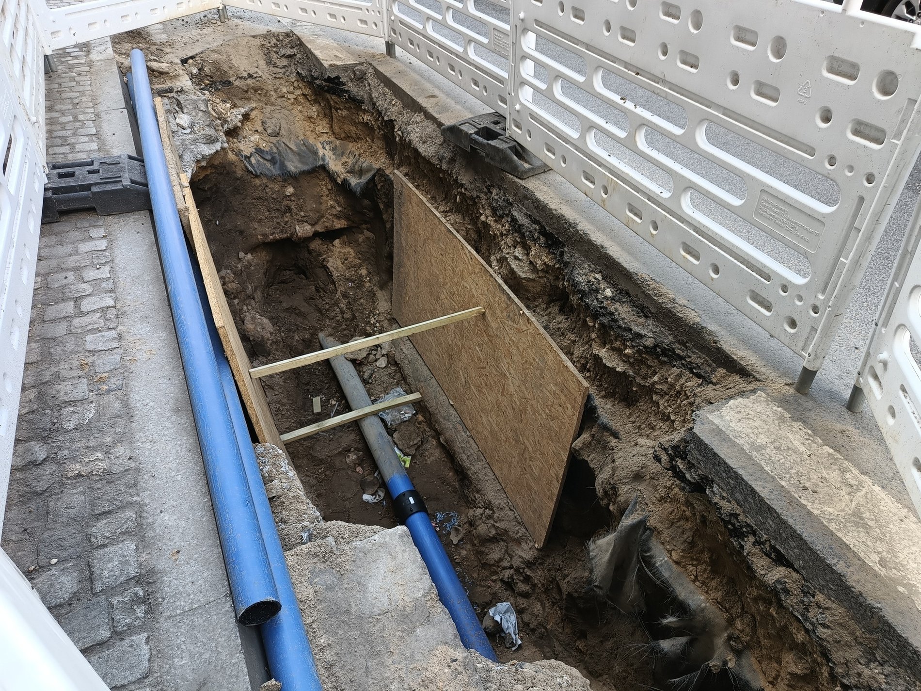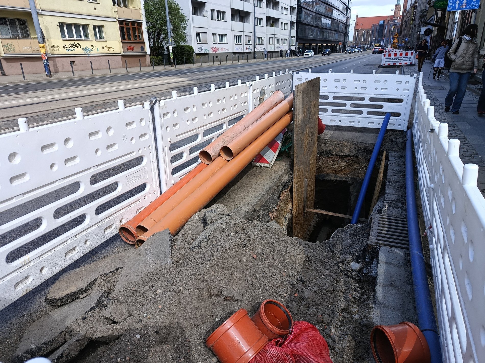 Zdjęcie podzielone na pól - z lewej - widoczny wykop z ułożonymi na dnie rurami z niebieskiego tworzywa, po prawej - ul. Skargi z wygrodzonym białymi płotkami wykopem - modernizacja sieci wodociągowej prowadzona przez MPWiK.