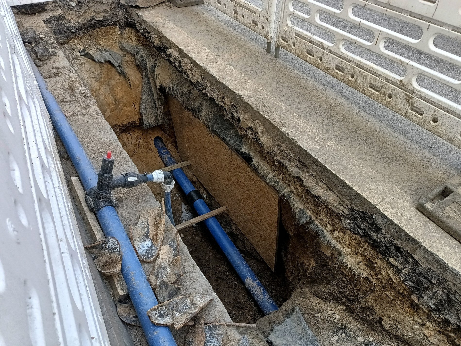 Zdjęcie podzielone na pól - z lewej - widoczny wykop z ułożonymi na dnie rurami z niebieskiego tworzywa, po prawej - ul. Skargi z wygrodzonym białymi płotkami wykopem - modernizacja sieci wodociągowej prowadzona przez MPWiK. Fot. Bartosz Wawryszuk/MPWiK
