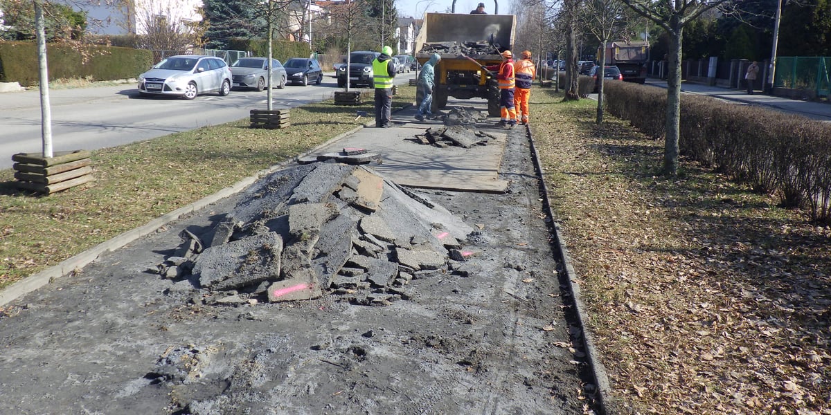 - remont uszkodzonej nawierzchni bitumicznej ścieżki rowerowej poprzez frezowanie wraz z cięciem nawierzchni z wywozem gruzu i utylizacją na łączną grubość do 4 cm oraz wykonanie warstwy wyrównawczej z betonu asfaltowego AC 8 S o grubości do 4 cm,