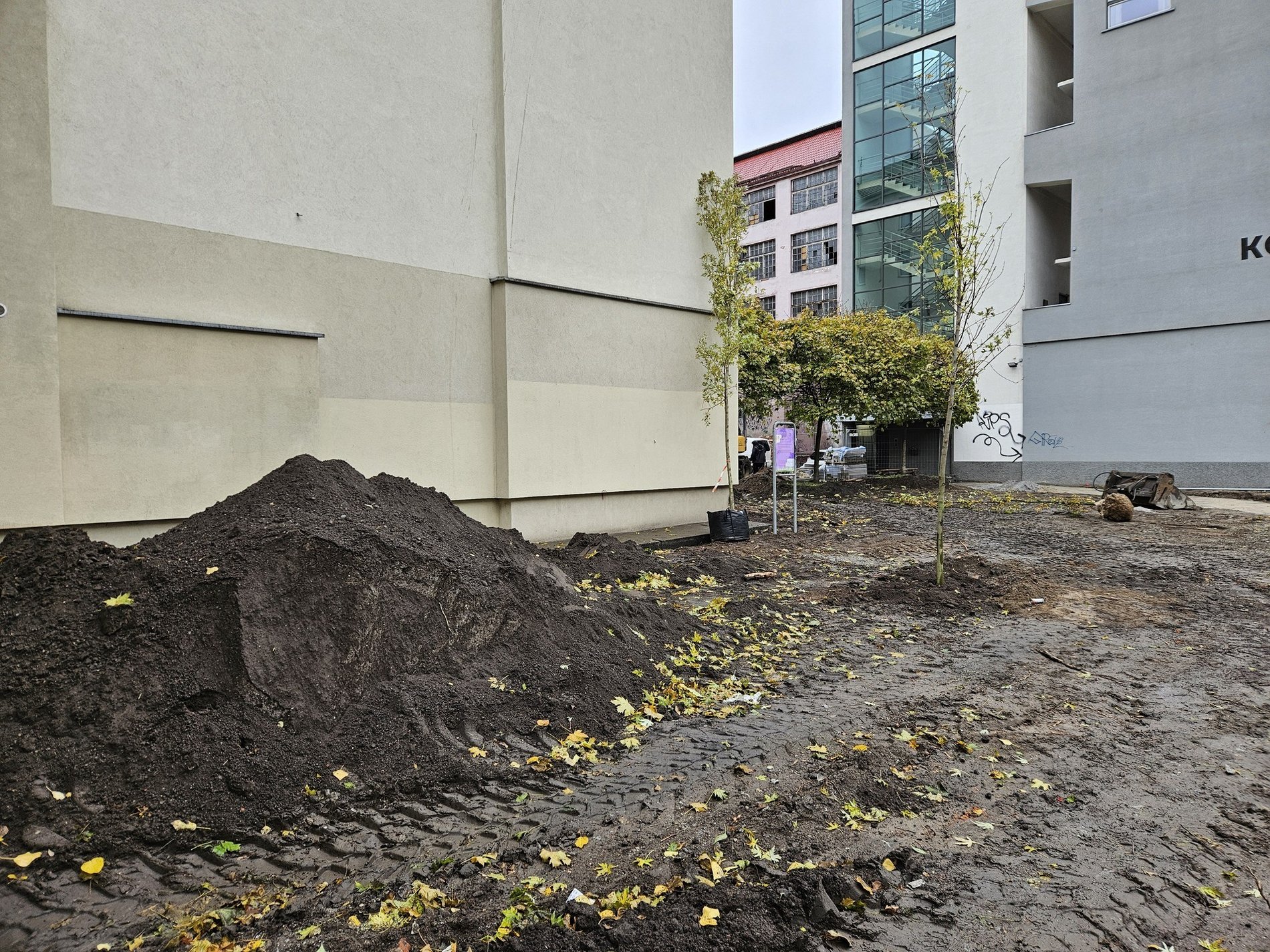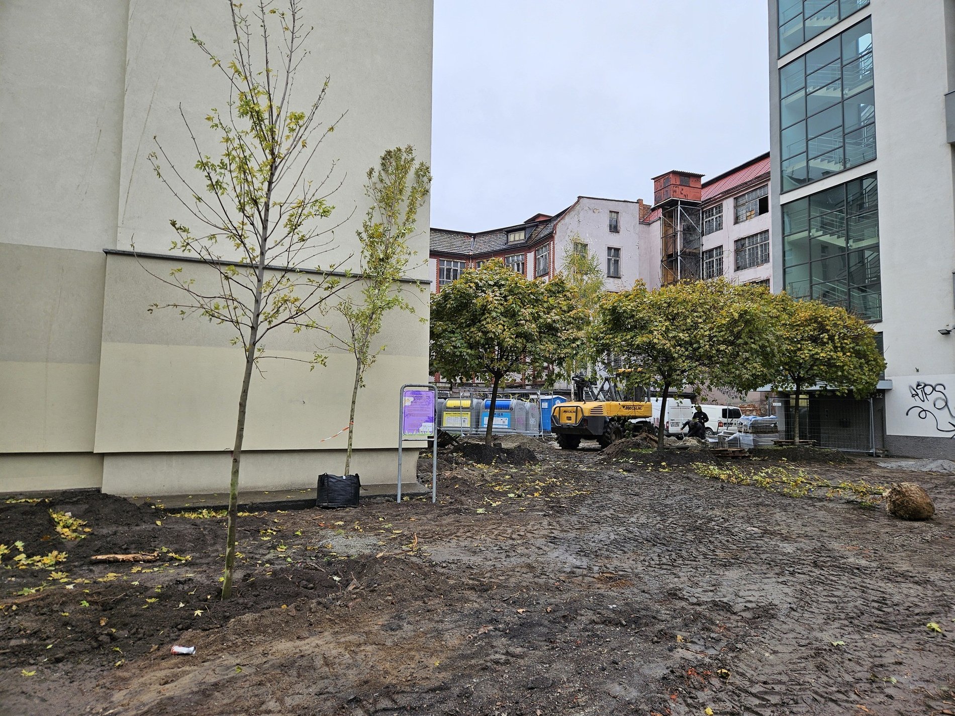 Na wyrównanym i oczyszczonym placyku posadzone zostały właśnie dwa klony srebrzyste (bliżej od ulicy). Stan drzew uzupełni jeszcze dąb kolumnowy, który ulokowany zostanie z tyłu zieleńca.