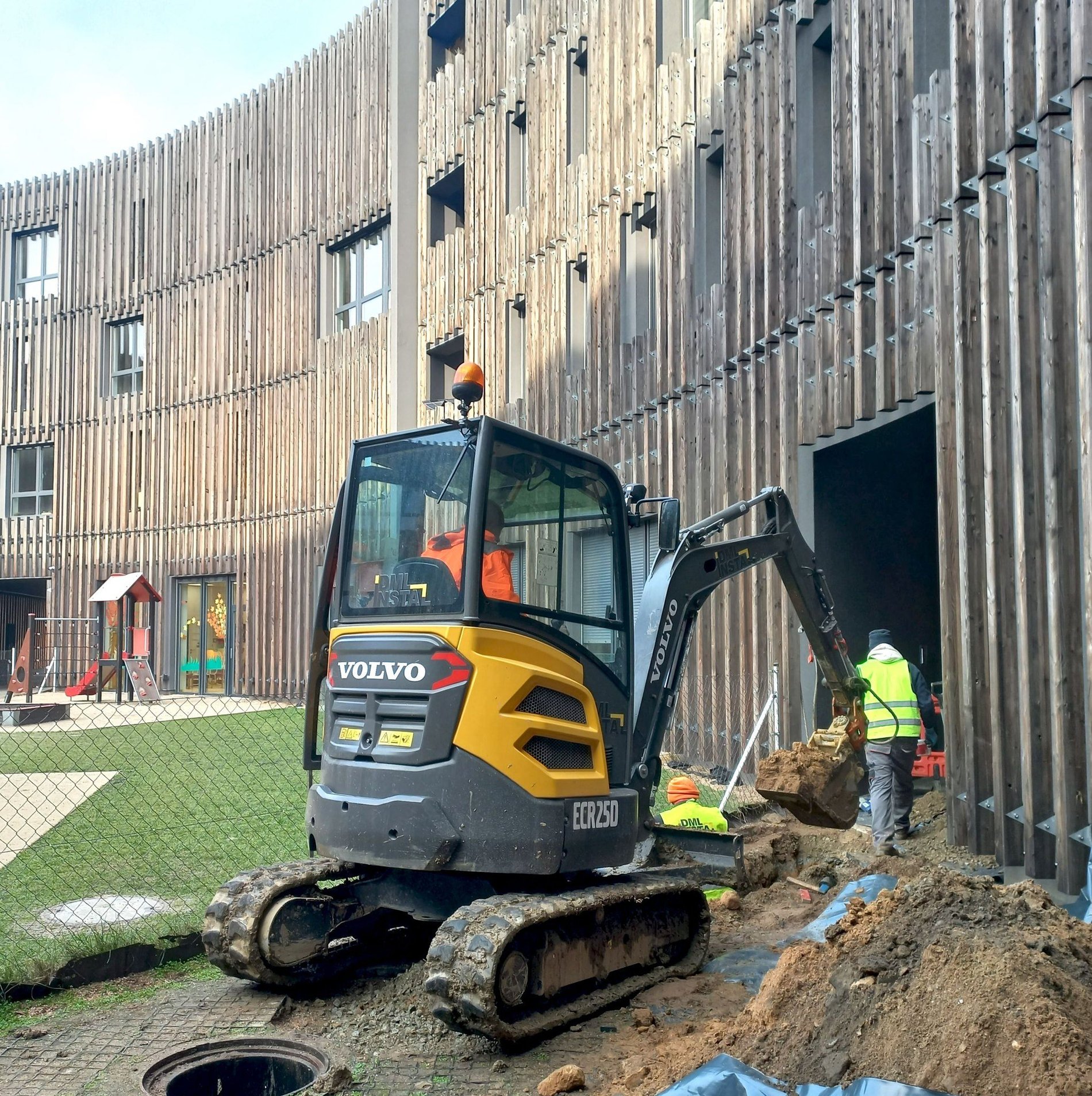 Ciężki sprzęt pojawił się na patio budynku TBS Wrocław na Nowych Żernikach, co oznacza rozpoczęcie niezbędnych napraw kanalizacji obsługującej obiekt. Prace wykonywane są w ramach gwarancji.