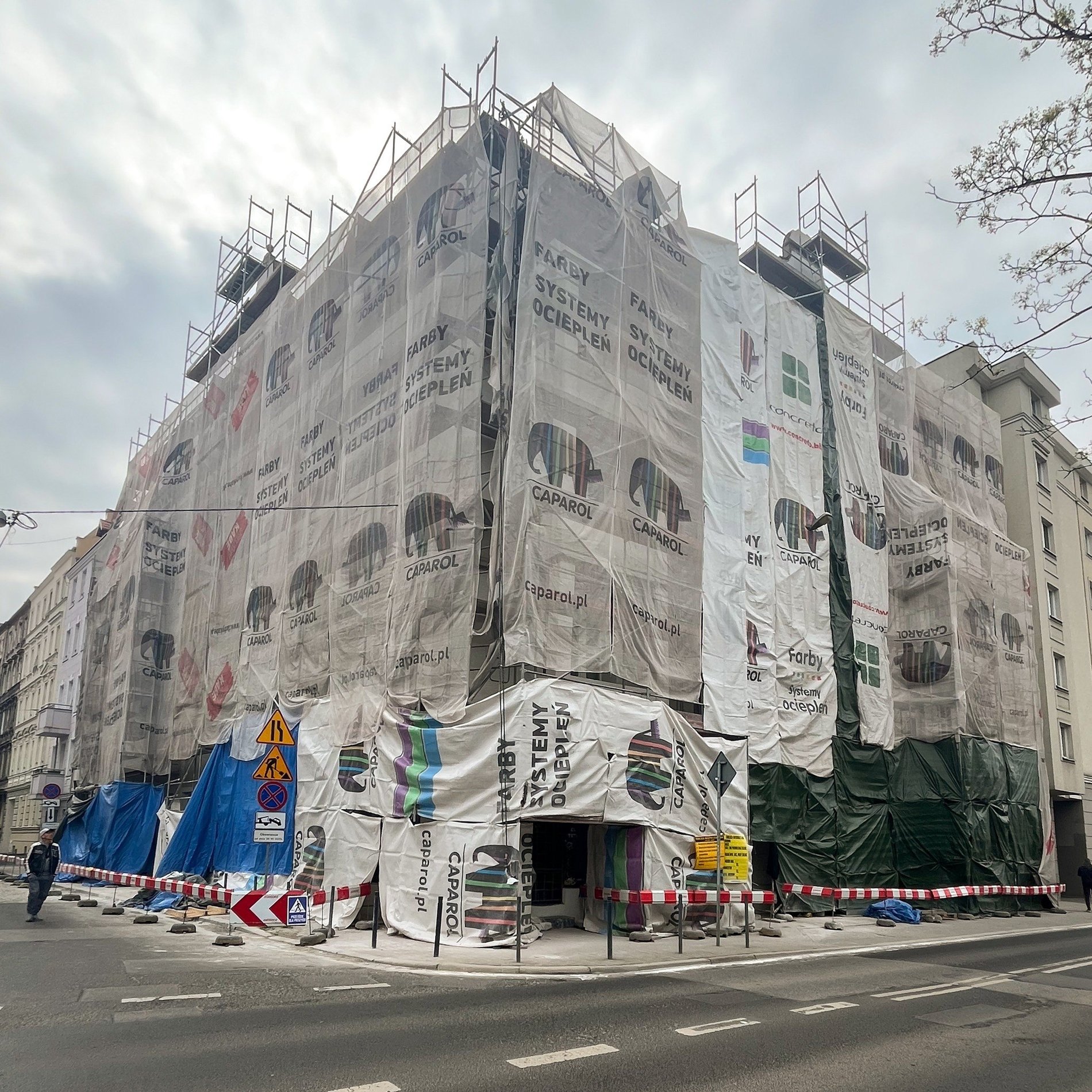 Ten narożny, gminny budynek na razie chowa się za rusztowaniami - a to zawsze dobry znak. Oznacza, że już za kilka miesięcy zobaczymy go w zupełnie nowej odsłonie. Zakres prac obejmuje remont elewacji północnej i zachodniej: nowe tynki, naprawę oraz odtworzenie oryginalnych detali fasady, a także remont balkonów.