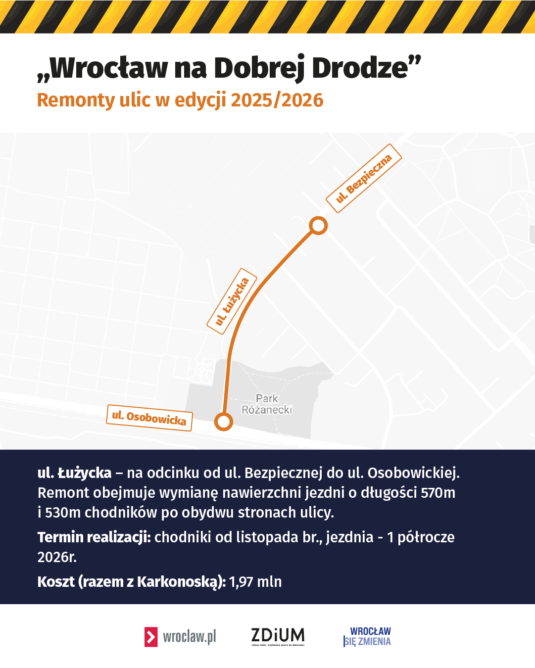 - Łużycka – pomiędzy Bezpieczną a Osobowicką (prace zaczęły się w ubiegłym roku od chodników),