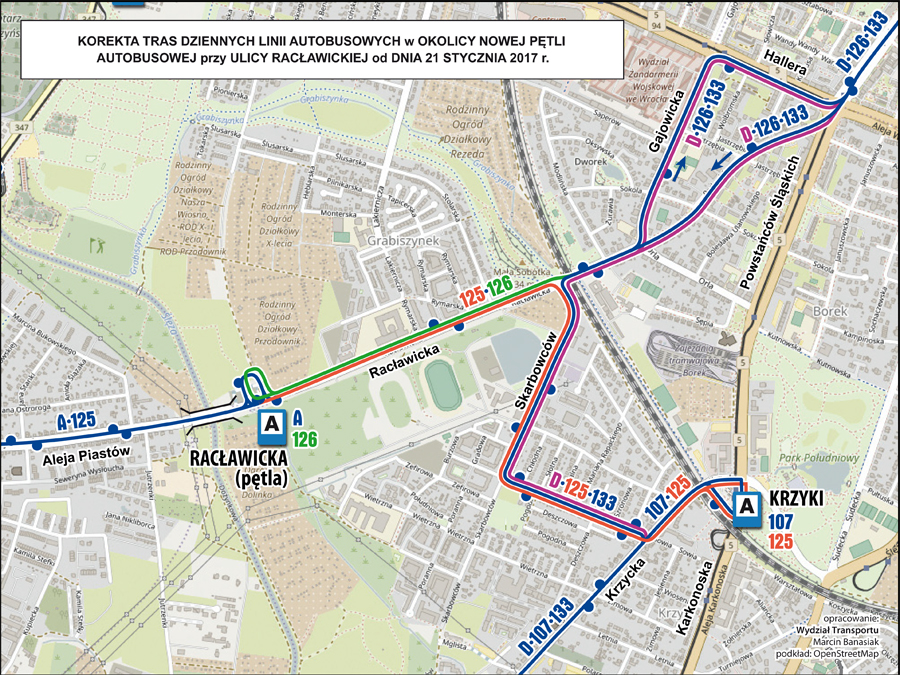 Autobusy linii 125 jadące z pętli Brochów będą kursowały w wydłużonej relacji do pętli Krzyki, w obu kierunkach przez ulicę Racławicką, Skarbowców, Sowią i Krzycką do pętli Krzyki. Kursy autobusów linii 126 zapewnią obsługę komunikacyjną ulicy Racławickiej dojeżdżając od strony ulicy Powstańców Śląskich do pętli przy ulicy Racławickiej.