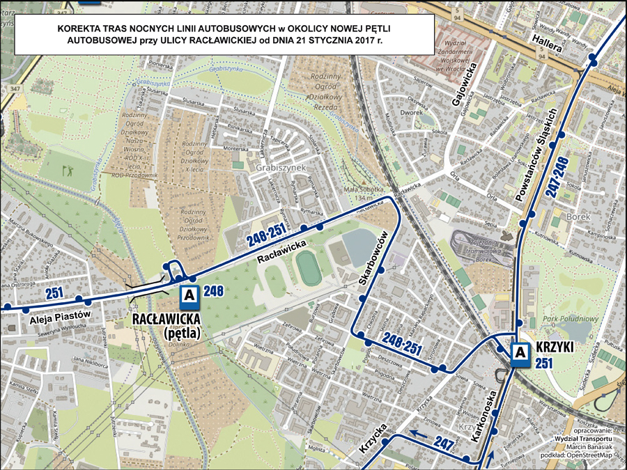 W porze nocnej, kursy linii 251 zostaną również wydłużone do pętli Krzyki przez ulicę Racławicką, Skarbowców, Sowią i Krzycką.