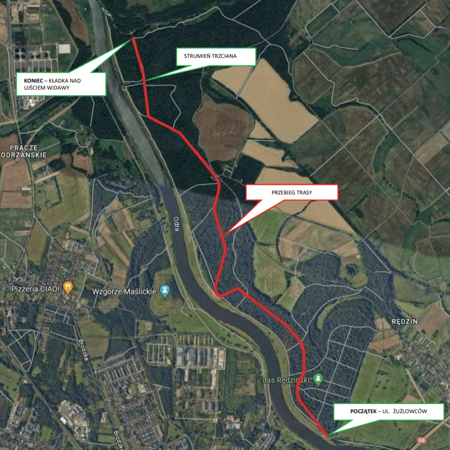 Przebieg projektowanej trasy rowerowej przez las Rędziński - od ul. Żużlowców do powstającej kładki nad Widawą Wrocławskie Inwestycje
