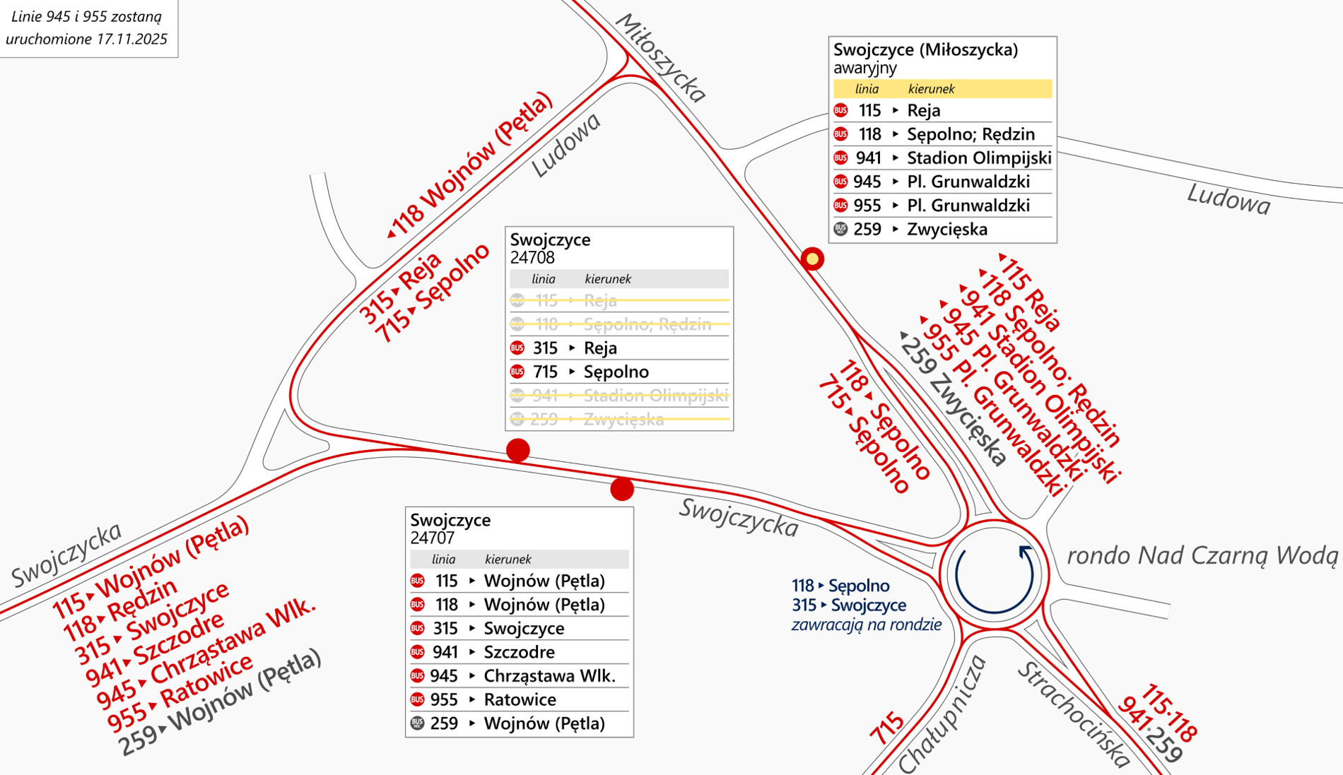 - Od soboty 15 listopada i poniedziałku 17 listopada autobusy linii 115, 118, 259, 315, 941, 945 i 955 zmieniają trasy.