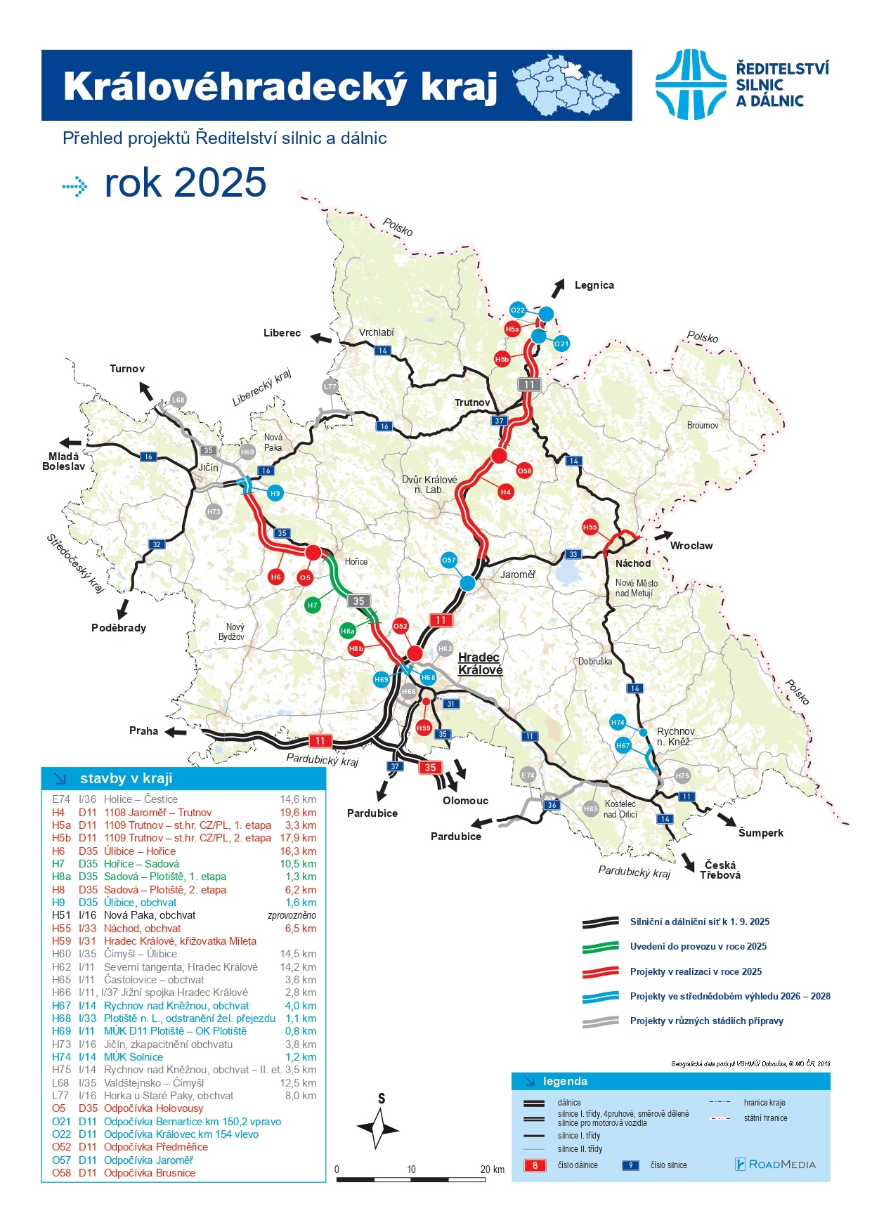 Zaawansowane są już roboty na odcinku Trutnovem a granicą z Polską. Budowa rozpoczęła się jesienią 2024 r., jej finał zaplanowano na pierwszą połowę 2028 r. Wcześniej - jesienią 2026 r. ma być gotowy 3,5 km odcinek trasy biegnący do granicy.