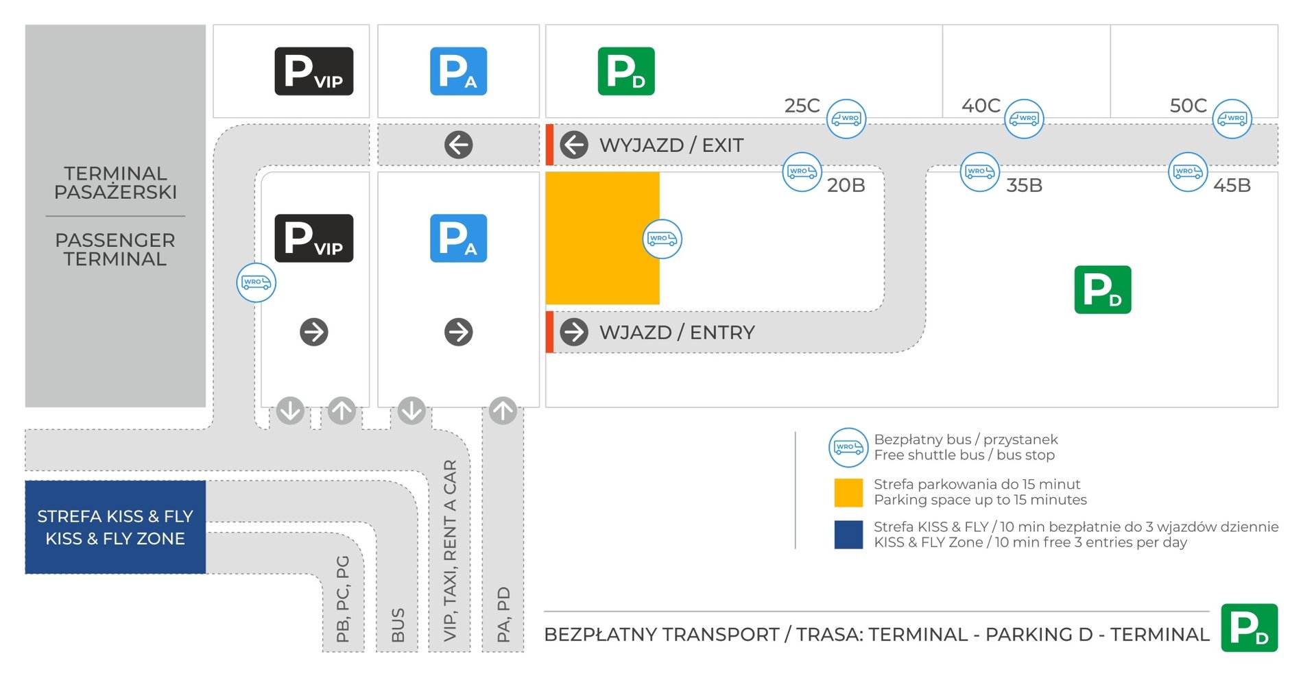 Wraz z rozpoczęciem sezonu letniego lotnisko uruchomiło również bezpłatny transfer z parkingu D. Elektryczny bus kursuje 24 godziny na dobę, zatrzymując się na ośmiu przystankach pomiędzy parkingiem a terminalem.