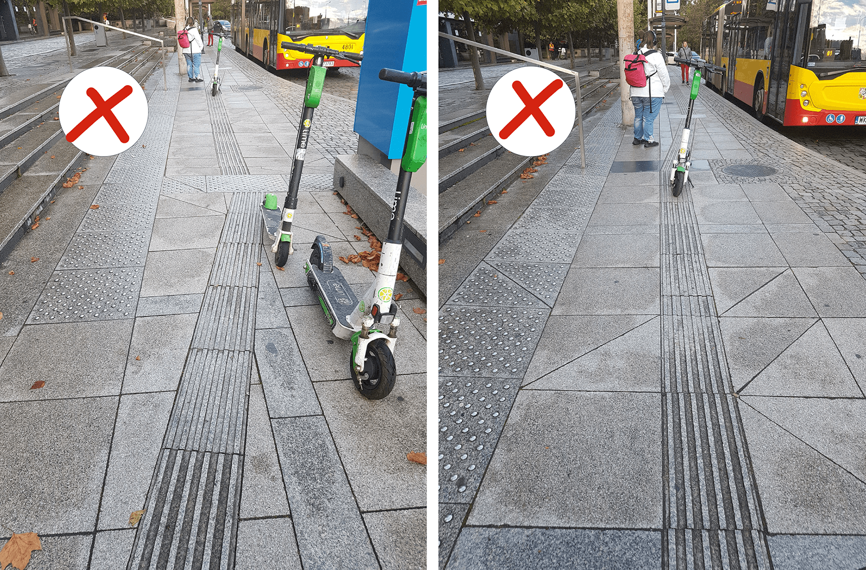 Uważaj, aby, parkując hulajnogę, nie zostawić jej na pasach lub bezpośrednio przy pasach prowadzących dla osób z niepełnosprawnością wzroku.