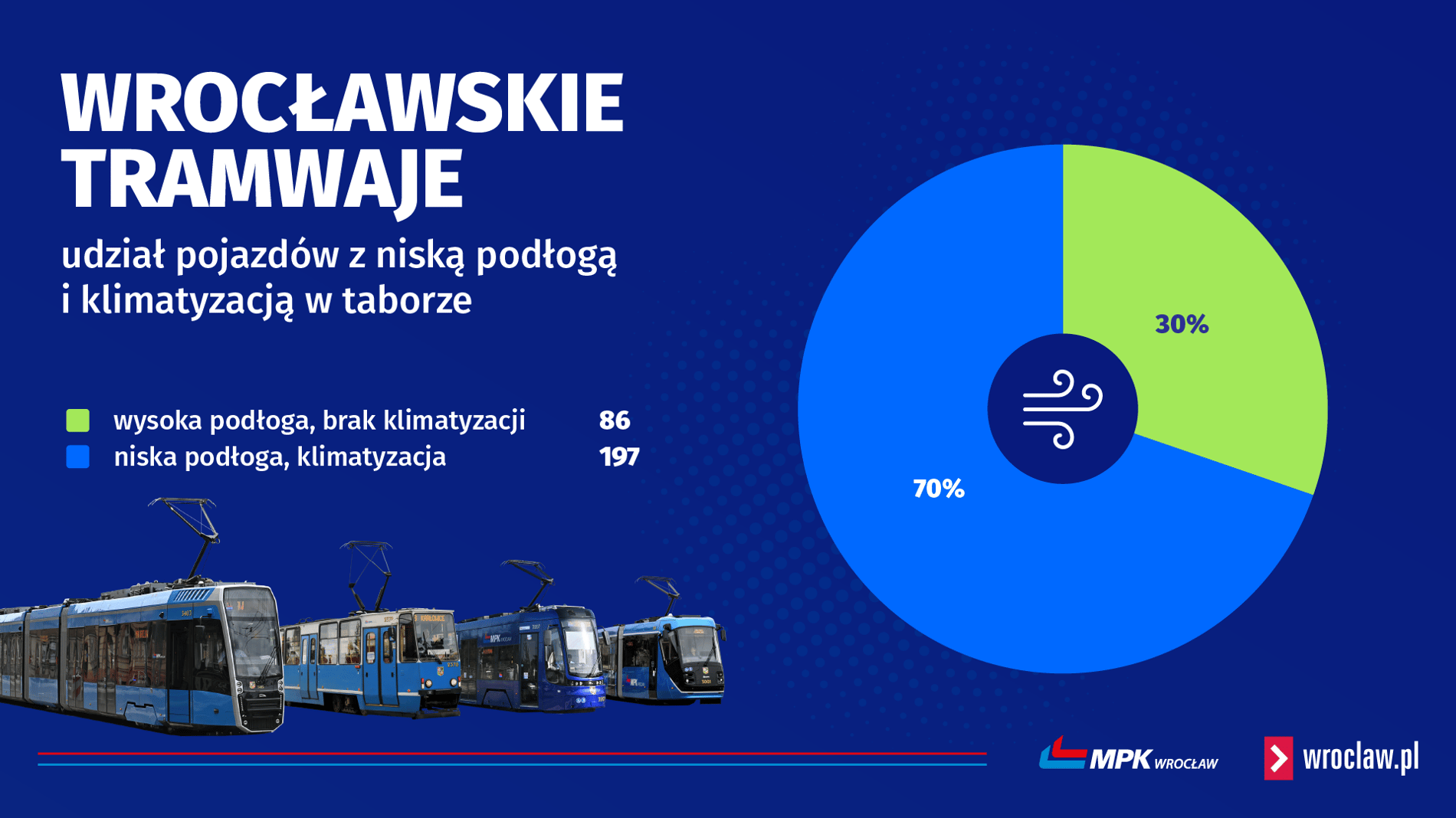 Inaczej sytuacja wygląda w tramwajach. W Moderusach Beta (tych granatowych z częściowo niską podłogą) oraz Pesach Twist 2010NW (też granatowych, w pełni niskopodłogowych), to motorniczowie ustalają temperaturę w przestrzeni pasażerskiej. Są poinformowani, że mają ją włączać w ciepłe dni.