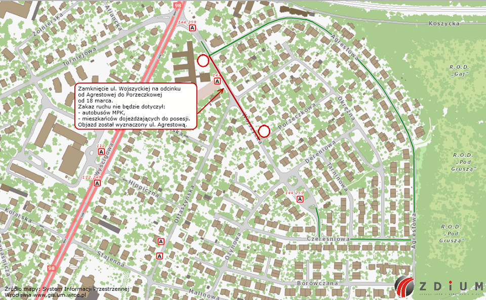 Przejazd po wspomnianym odcinku, zawężonym do połowy jezdni, będzie możliwy wyłącznie dla autobusów MPK oraz mieszkańców przyległych posesji. Objazd dla ruchu tranzytowego został wyznaczony ulicą Agrestową.