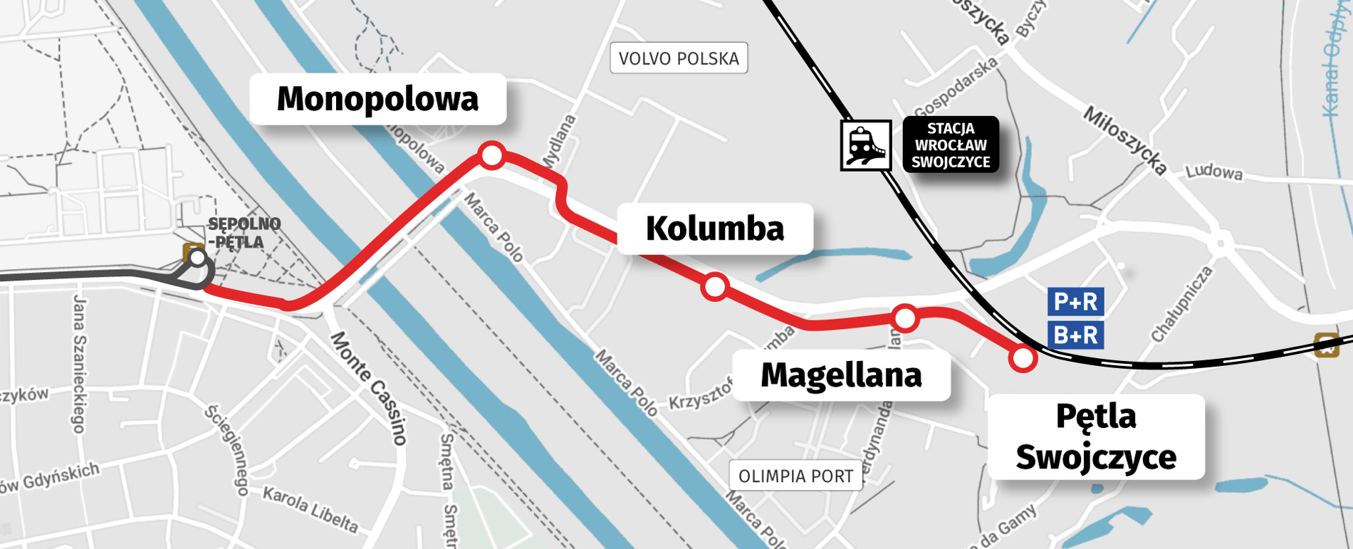 Jeśli chodzi o tramwaj, to powstanie krótki odcinek torów między pętlą "Sępolno" a istniejącymi torami na mostach Chrobrego. Właśnie z myślą o nowej linii na Swojczyce zostały wybudowane razem z mostami. Dalej od mostów torowisko pobiegnie przy ulicy Swojczyckiej.