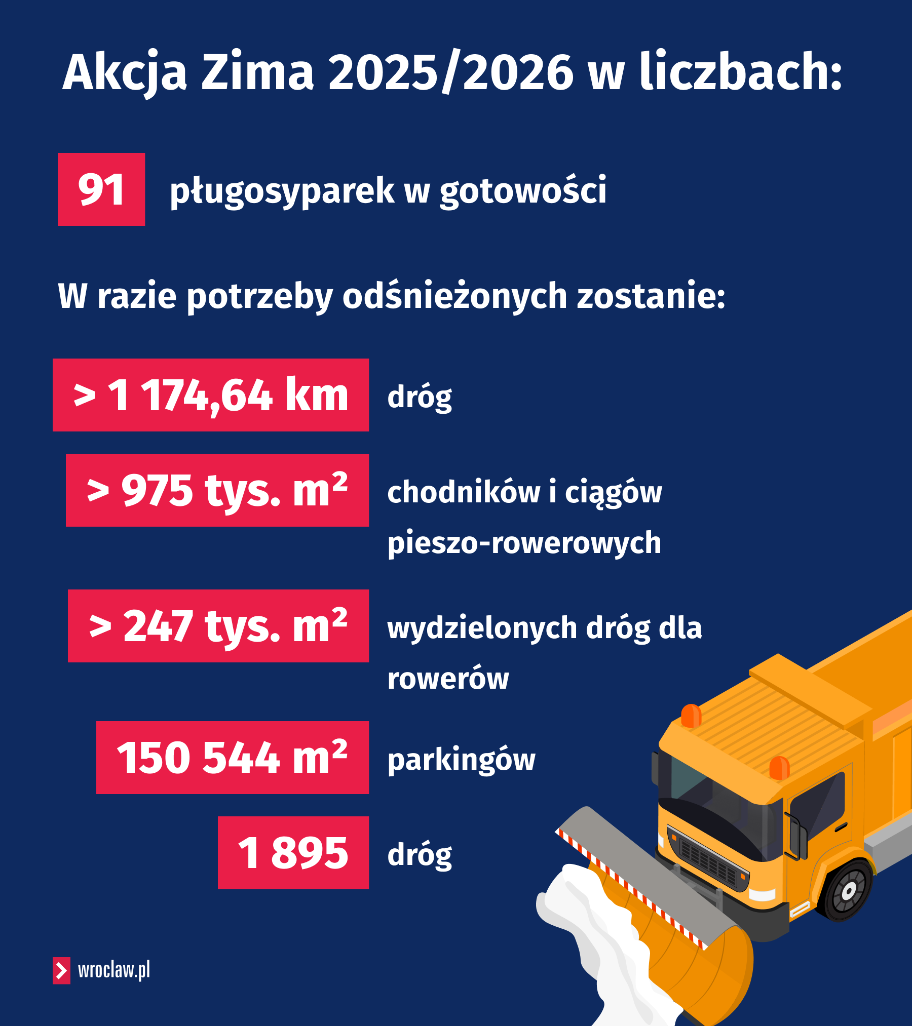 Sezon zimowy 2025/2026 obejmuje okres od 1 listopada 2025 r. do 31 marca 2026 r. Nadzór nad zimowym utrzymaniem dróg - łącznie 1174,64 km - w imieniu Gminy Wrocław sprawuje Ekosystem Spółka z o.o.