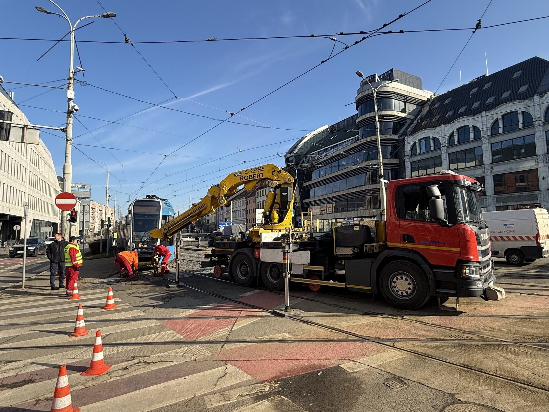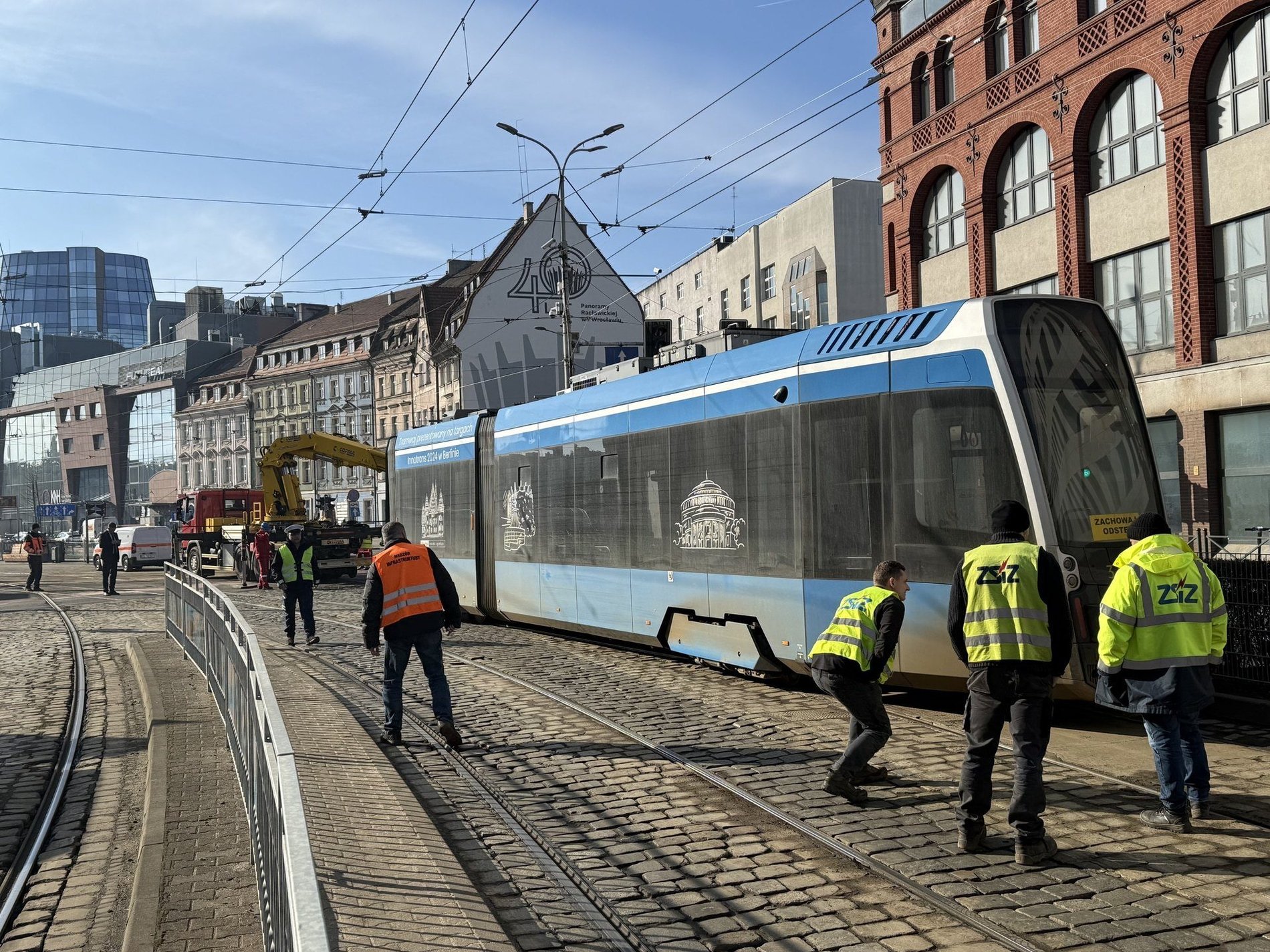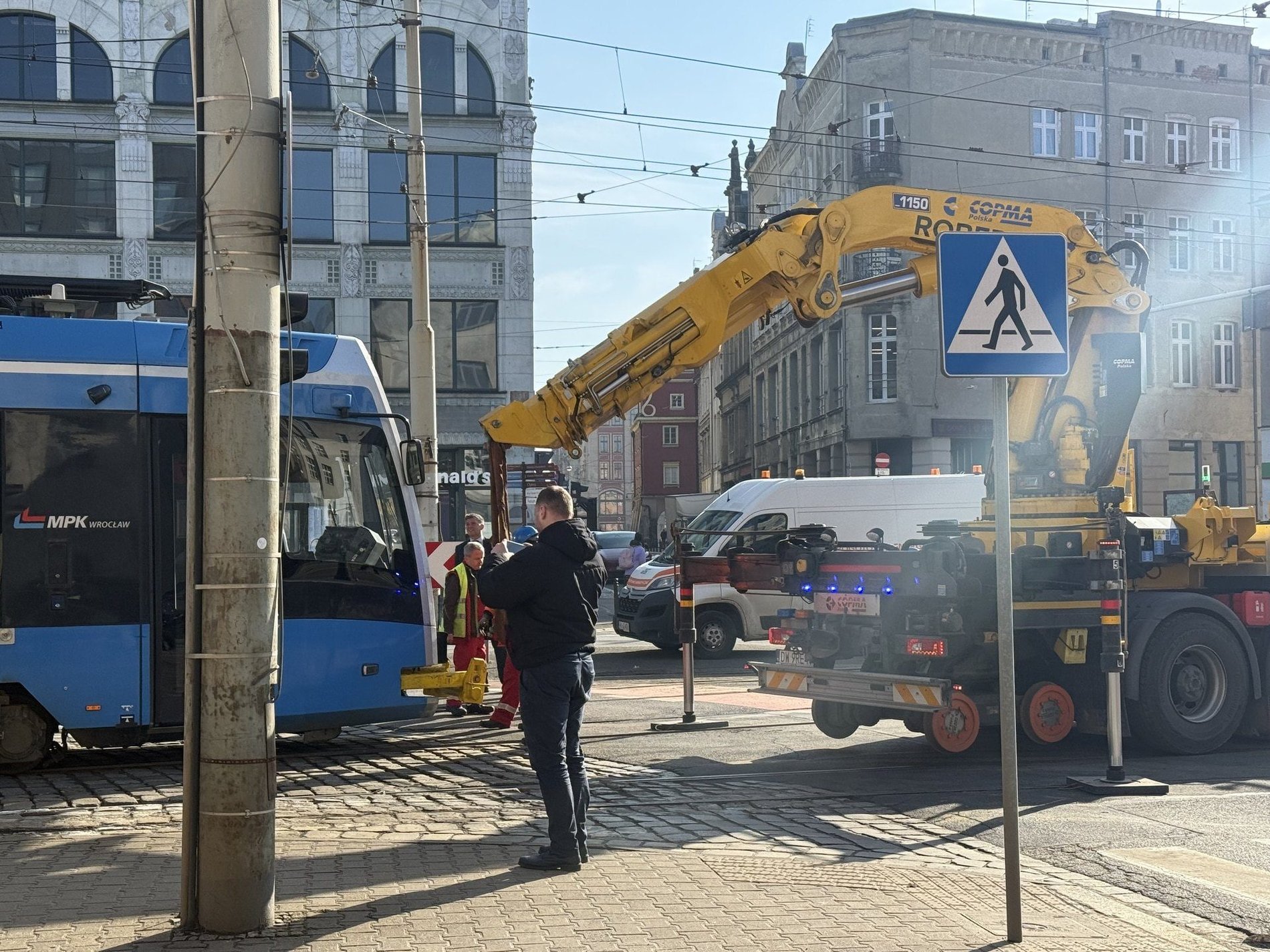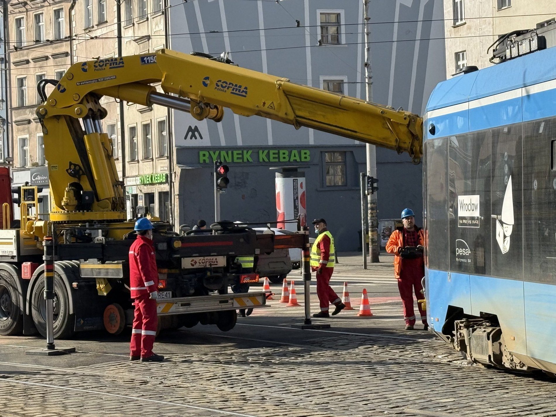 W miejscu gdzie tramwaj wypadł z szyn stoi już dźwig. MPK Wrocław informuje, że utrudnienia potrwają przez następne 45 minut.