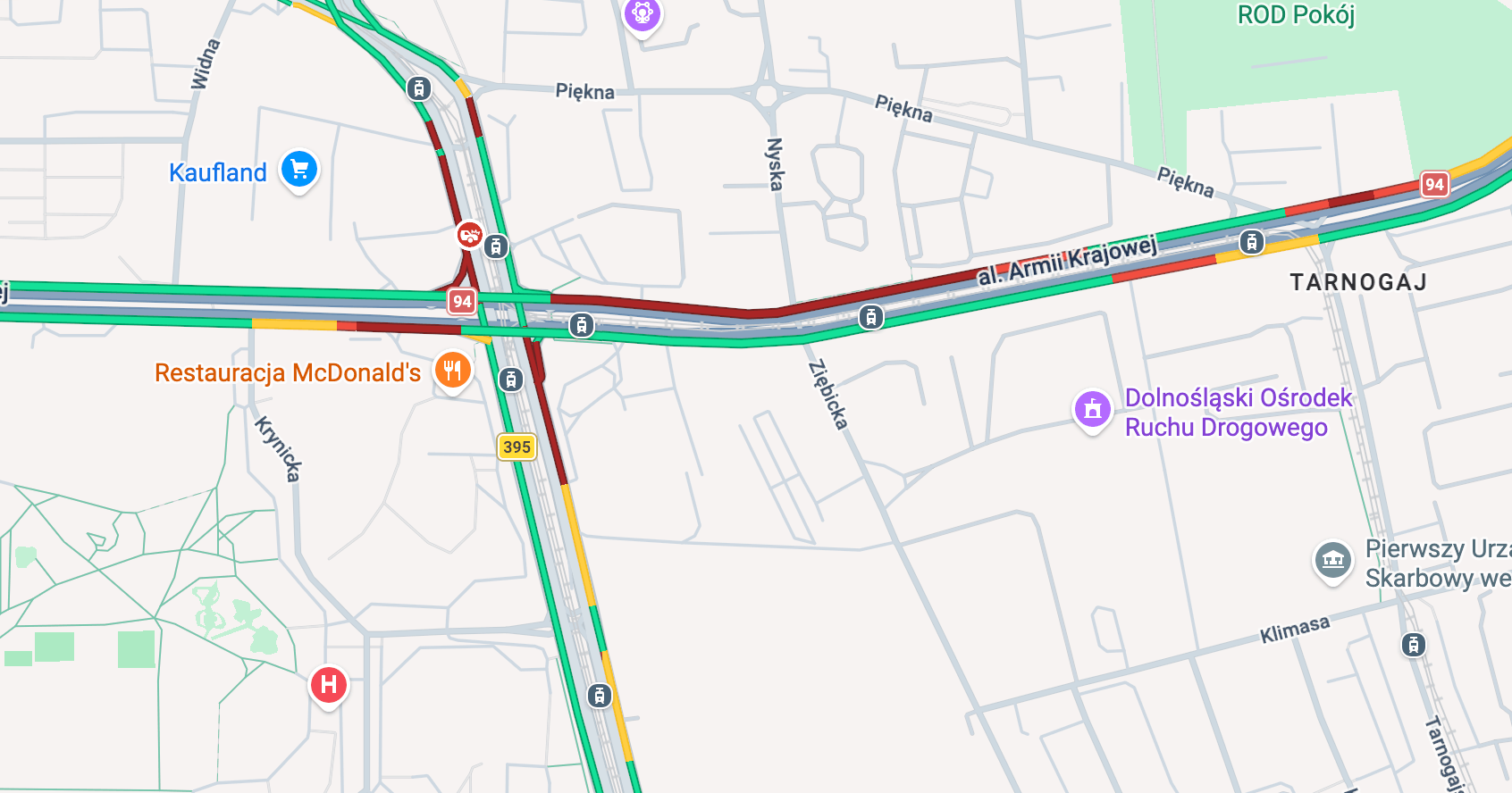 Na Bardzkiej, Armii Krajowej i w ich najbliższych okolicach są utrudnienia w ruchu. Skrzyżowanie jest przyjezdne (choć przez pewien czas było zablokowane), ale poruszamy się wolno.