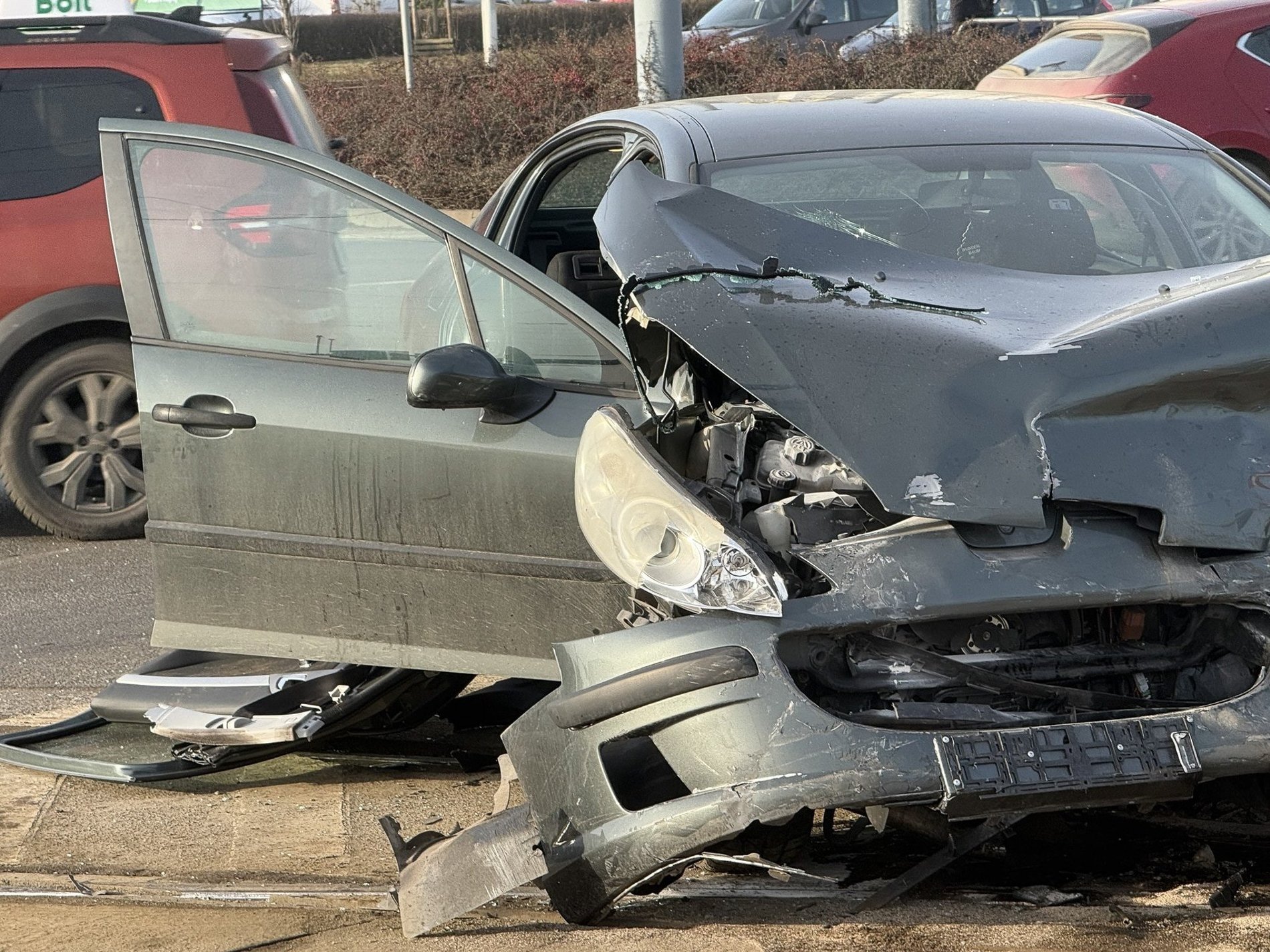 Samochody nadal stoją przy skrzyżowaniu. Zderzyły się Peugeot (uderzony z boku z prawej strony, ma też zgnieciony przód), drugi z samochodów to BMW.