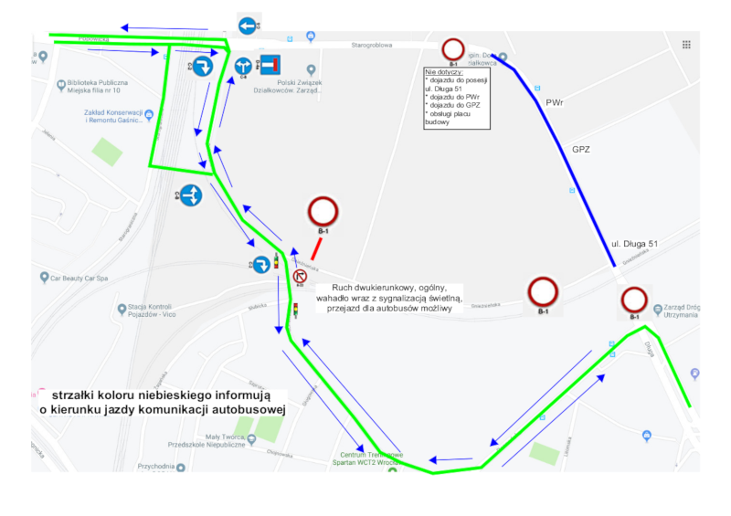 Zmiana organizacji ruchu jest niezbędna, ponieważ wykonawca będzie w tym tygodniu realizował kolejne prace na „Budowie trasy tramwajowej wzdłuż ulicy Starogroblowej – Długiej – Milenijnej do Jagiełły wraz z przebudową wiaduktu nad ul. Długą oraz budową zintegrowanego węzła tramwajowo-kolejowego Wrocław Popowice”.