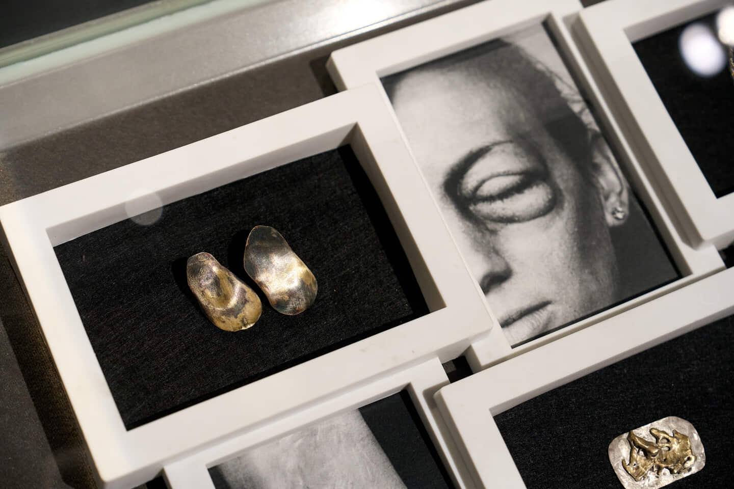 Gdyby nie zdjęcia ułożone obok kolczyków wyglądałyby jak oryginalna kompozycja. Ale ich kształt i kolor to przeniesienie kształtu i koloru siniaka, jakiego jednej z kobiet nabił jej partner, na srebro.