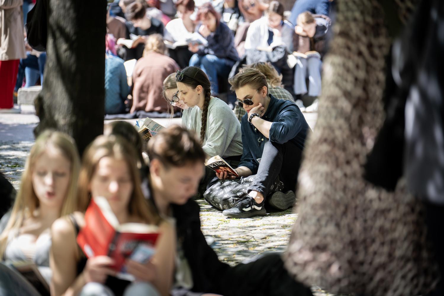 O godzinie 13 wszyscy mniej więcej na kwadrans zatopili w lekturze, jedni usadowieni wygodnie na leżakach albo na ławkach, inni na stojąco, opierając się o fontannę albo siedząc po turecku na ziemi.