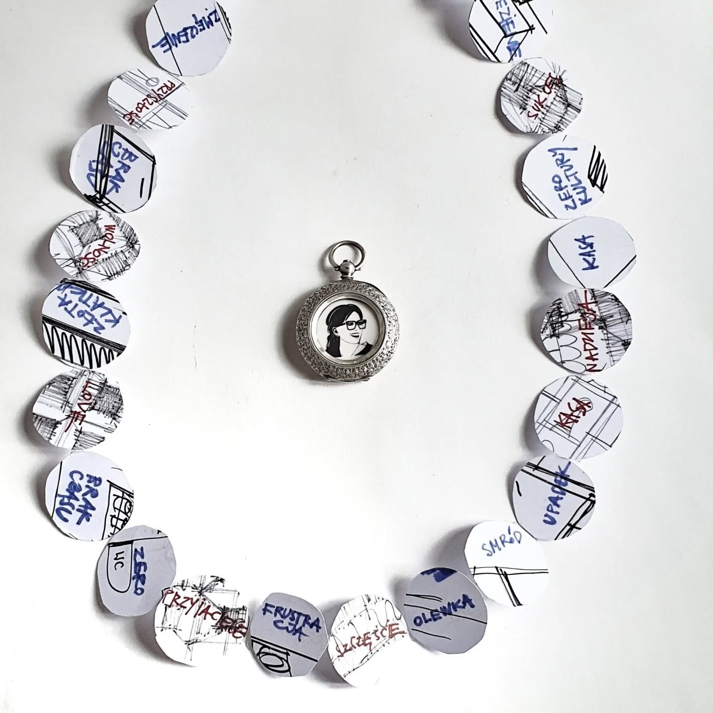 Z zapisanych haseł powstał papierowy naszyjnik, który schowany został w starej kopercie od zegarka symbolizującego upływający czas. Na tylnej ściance koperty umieściłam ściśle tajną intencję. A zamiast klasycznego cyferblatu kopertę wieńczy własnoręcznie wykonany portret mojej bohaterki – wyjaśnia Dominika Kuźniar.