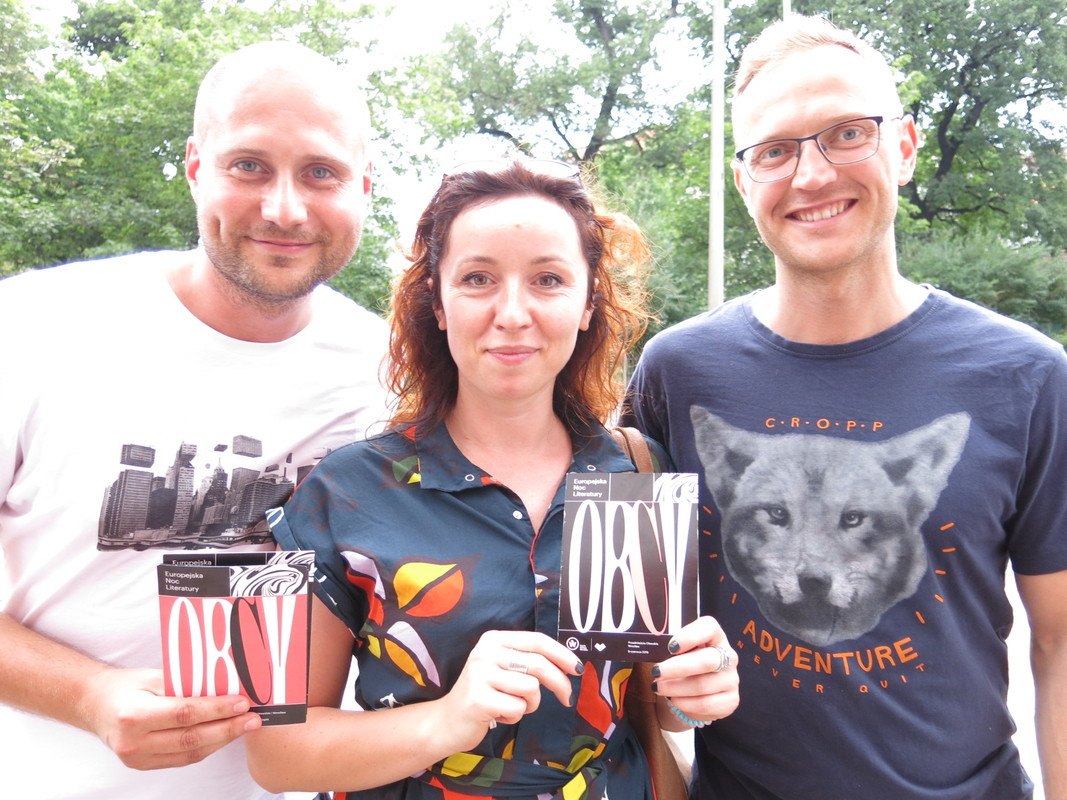 – Kolega, który mieszka na Przedmieściu Oławskim nas zaprosił i przyjechaliśmy. Na Nocy Literatury jesteśmy kolejny raz. Tym razem szczególnie chciałabym zobaczyć na żywo Jacka Knapika i Dawida Ogrodnika. Niestety z powodu kolejki nie weszliśmy do Konsulatu Niemiec – mówi Sławka, której towarzyszyło dwóch Tomaszów. Fot. Jarek Ratajczak