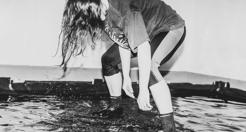 Agata Gabiś, jedna z kuratorek wystawy "Niedziela w Hutmenie" w Muzeum Architektury we Wrocławiu, w tle zdjęcie pracowników zakładu ze zbiorów Ossolineum wykonane przez S. Kokuroicza w 1975 roku