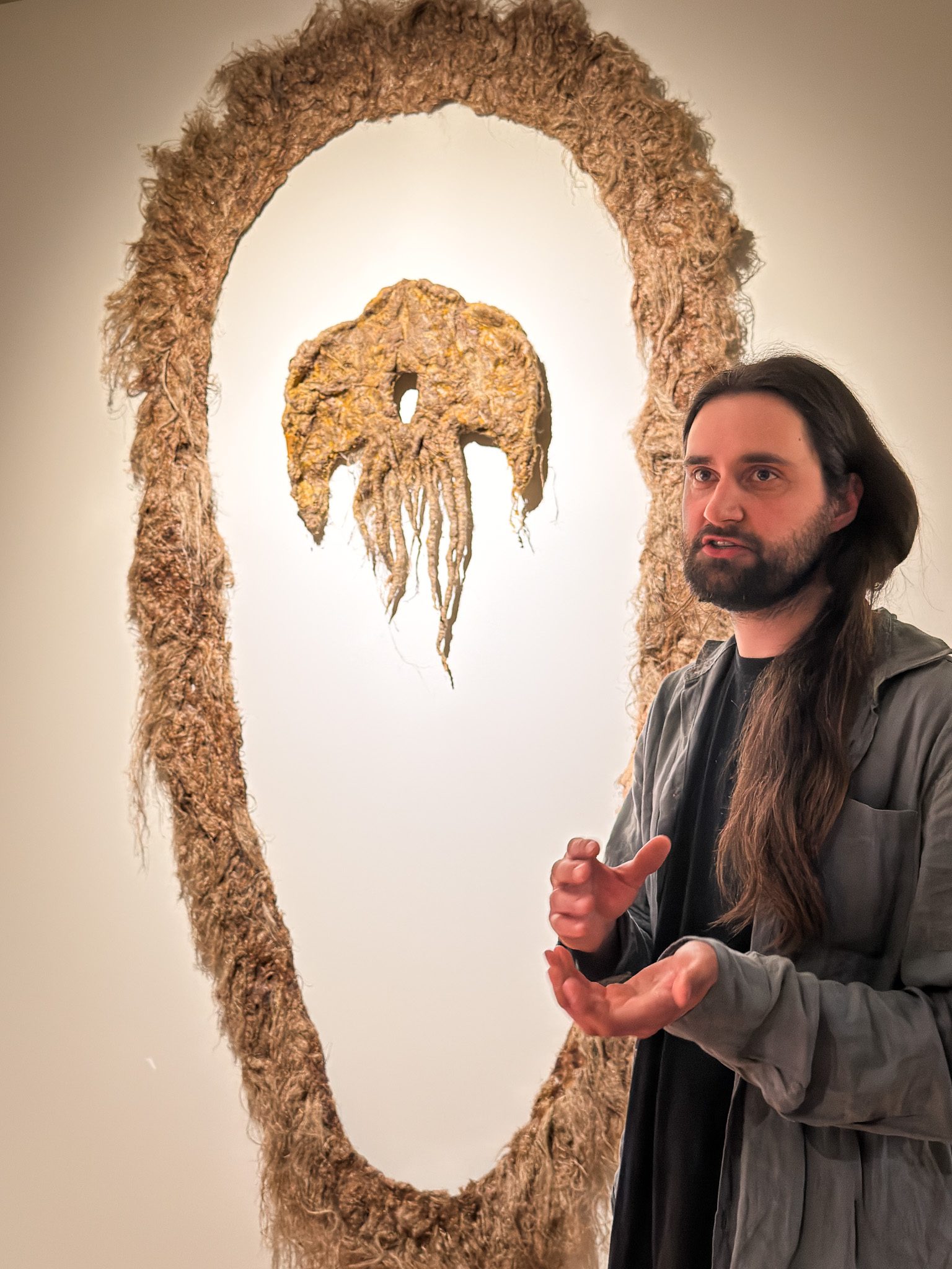- Do stworzenia tej pracy zainspirowało mnie pogańskie wierzenie o dębie, którego korzenie obejmują trzy światy. Ta praca jest alegorią walki człowieka z ogniem, której czasem po prostu nie da się wygrać - mówi Danilkin podczas oprowadzania.
