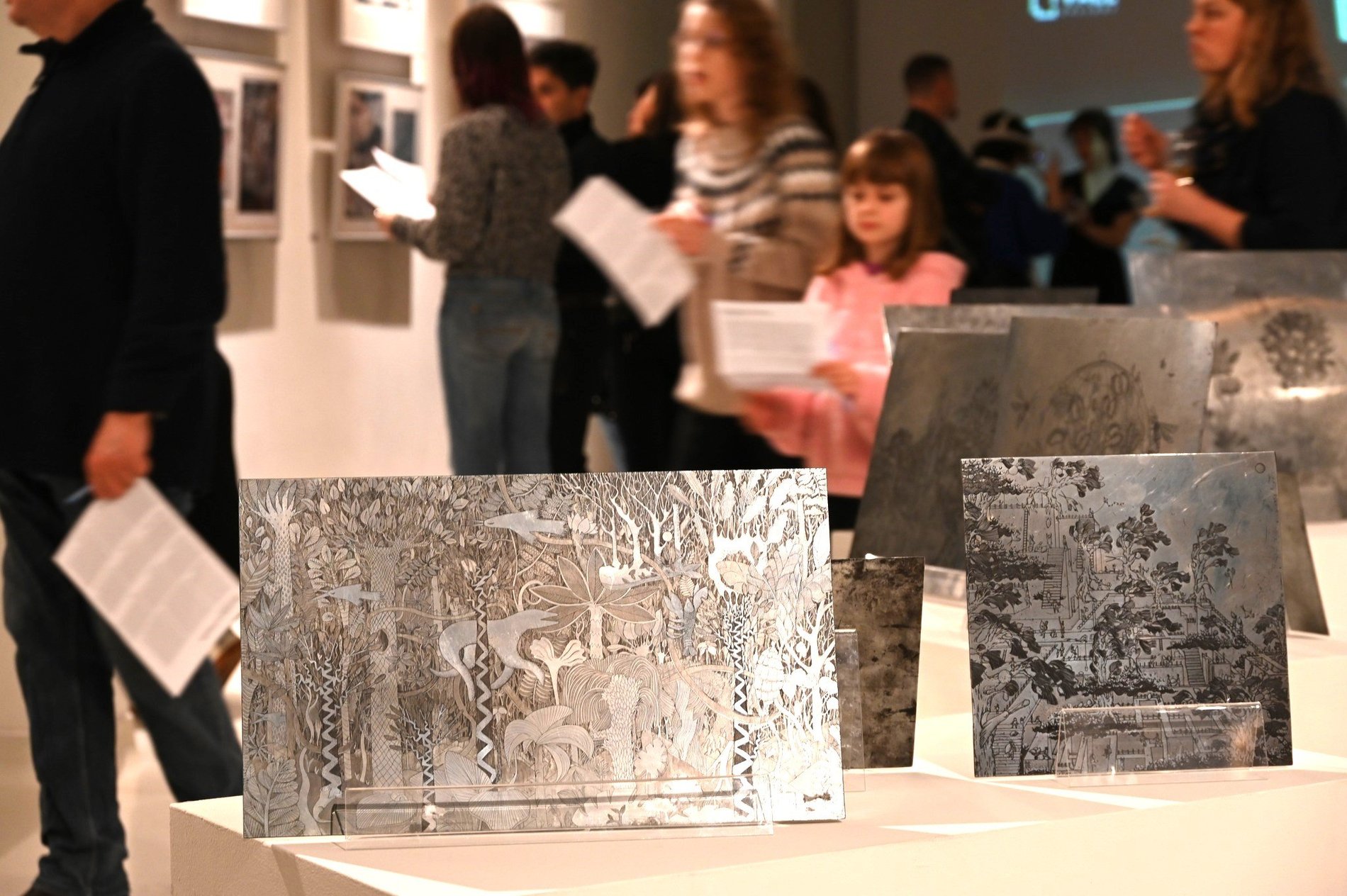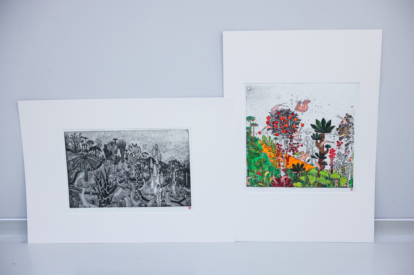Na wystawie „Sen dzikich ptaków” obejrzymy nie tylko odbitki graficzne – zarówno czarno-białe, jak i barwne – ale także matryce, co pozwala porównać, jak ta sama praca funkcjonuje w wersji monochromatycznej i kolorowej.