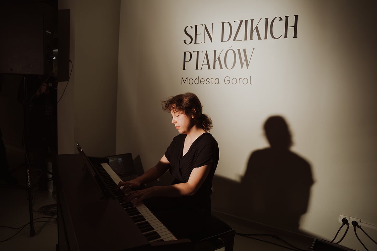 Podczas wernisażu Modesta Gorol zagrała na pianinie własne kompozycje tworzone w kontekście prac pokazanych na wystawie „Sen dzikich ptaków”.
