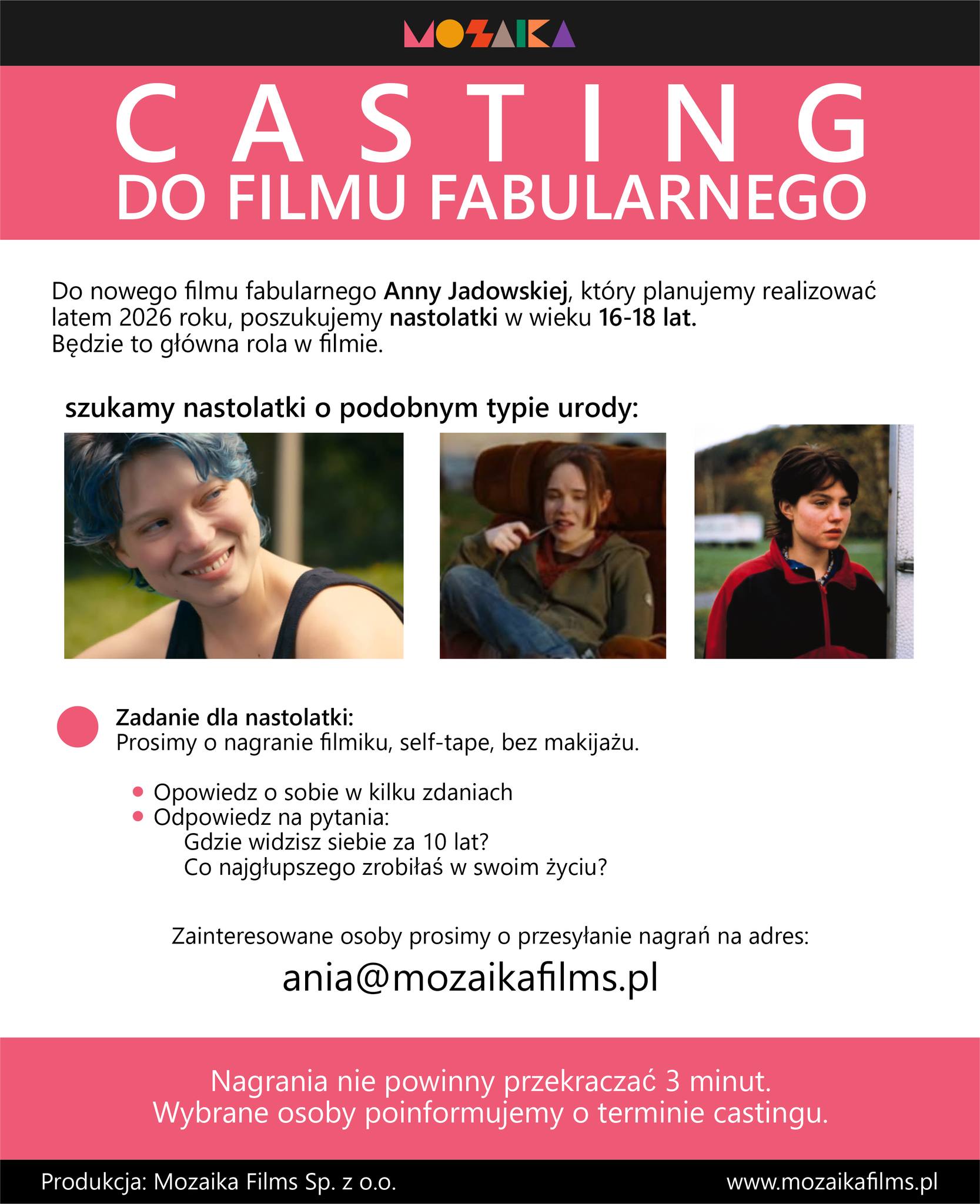 Realizatorzy czekają na zgłoszenia do końca lutego 2026 r. Na adres ania(at)mozaikafilm.pl należy przesłać trzyminutowe filmiki (self-tape) z prezentacją oraz odpowiedziami na pytania postawione w ogłoszeniach o castingu.