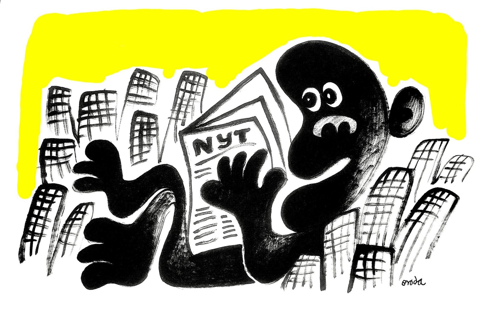– King Kong jest symbolem Nowego Jorku, ikoną popkultury, wdrapywał się na Empire State Building, a na moim rysunku właśnie zszedł (bądź zlazł) z wieżowca i czyta „The New York Timesa” – mówi Tomasz Broda.